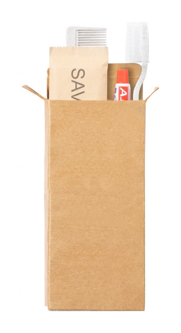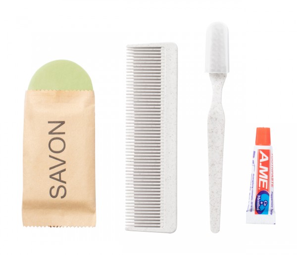 Set de cosmetică, 4 buc, include o periuță de dinți din plastic din paie de grâu, o pastă de dinți, un pieptene și un săpun. În cutie de hârtie kraft.