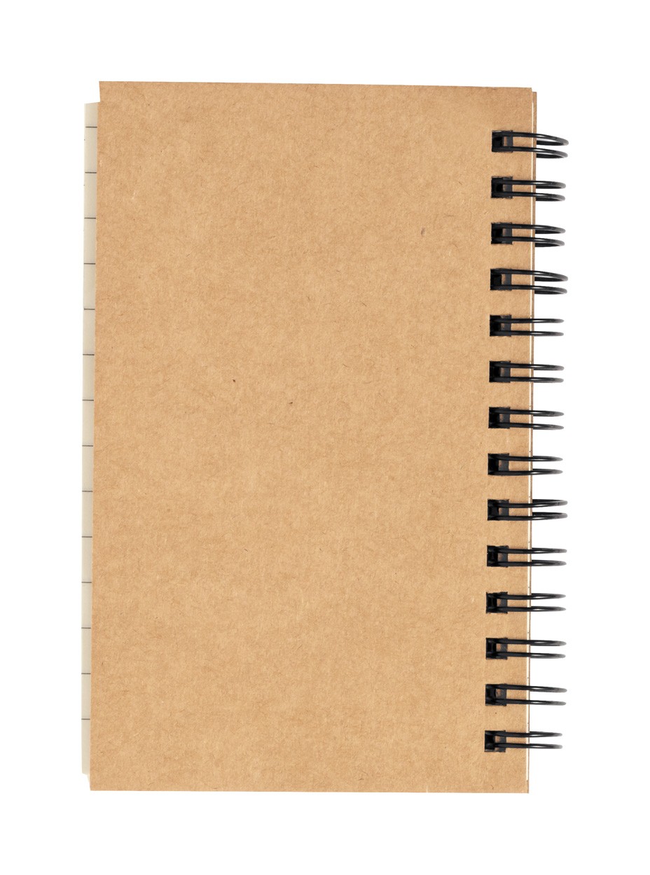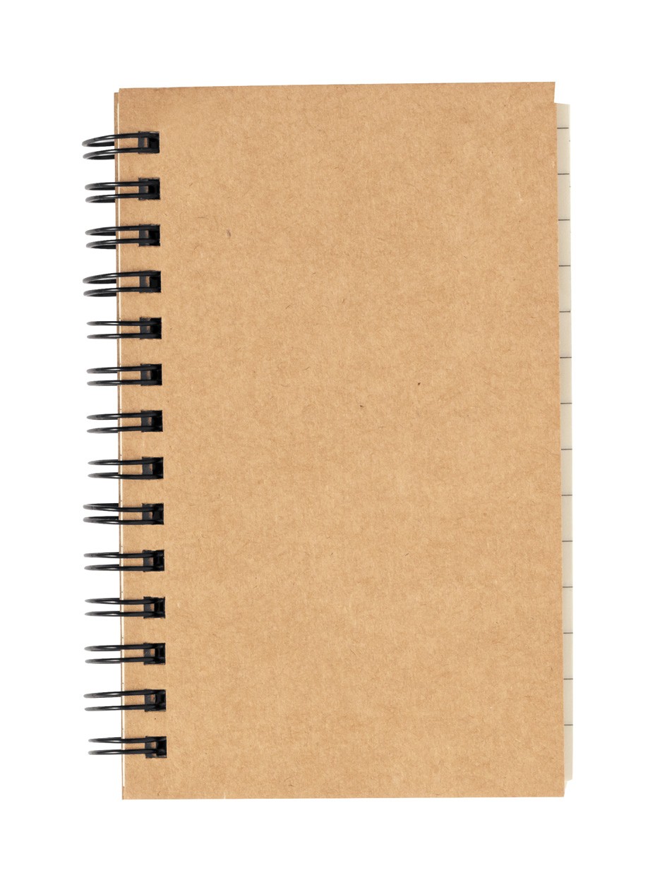 Recycled cardboard covered spiral notebook with 70 lined sheets, 25 sticky notes and 125 page markers (in 4 colours).