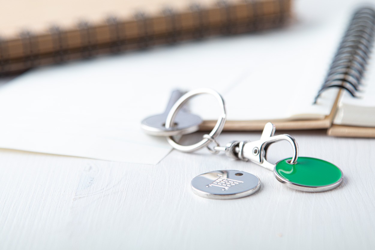 Breloc cu fisa pentru carucior.O parte a fisei este colorata,cealalta are gravata un carucior. Dimensiune fisă: ø23×1,7 mm.