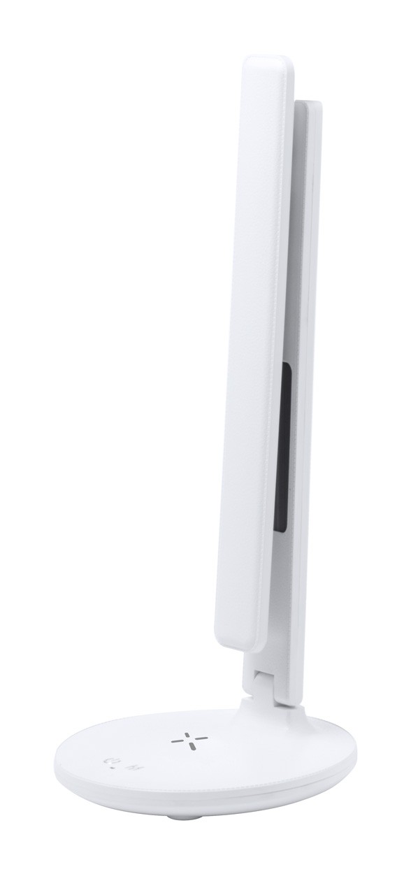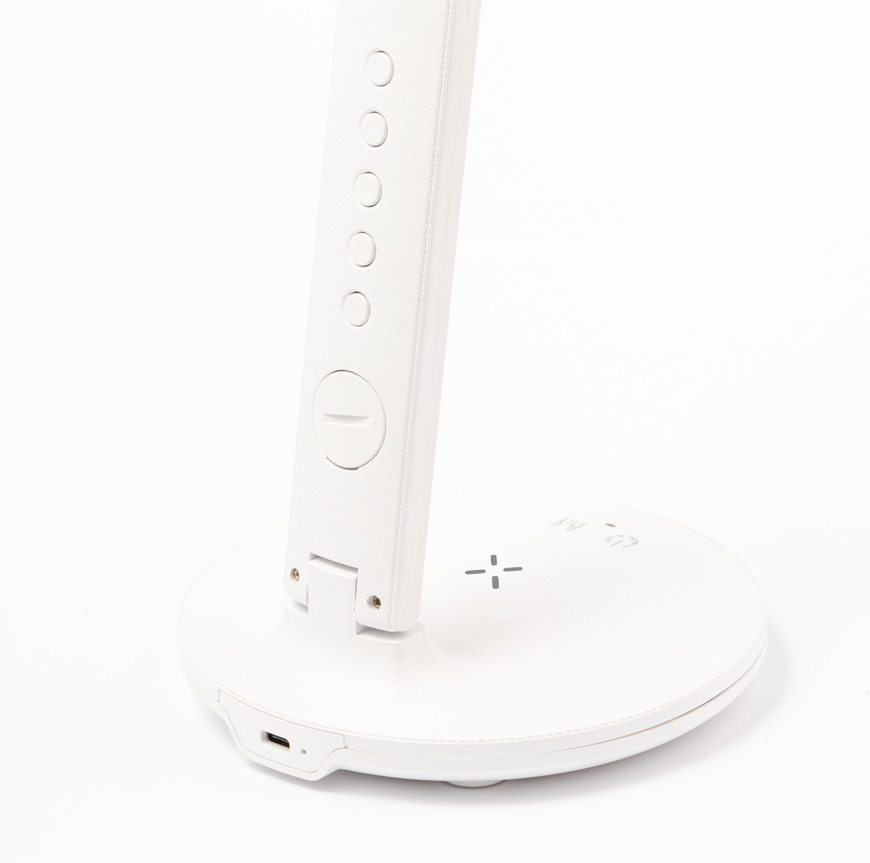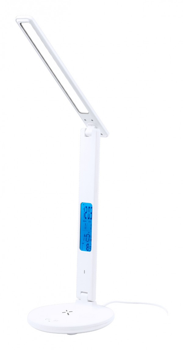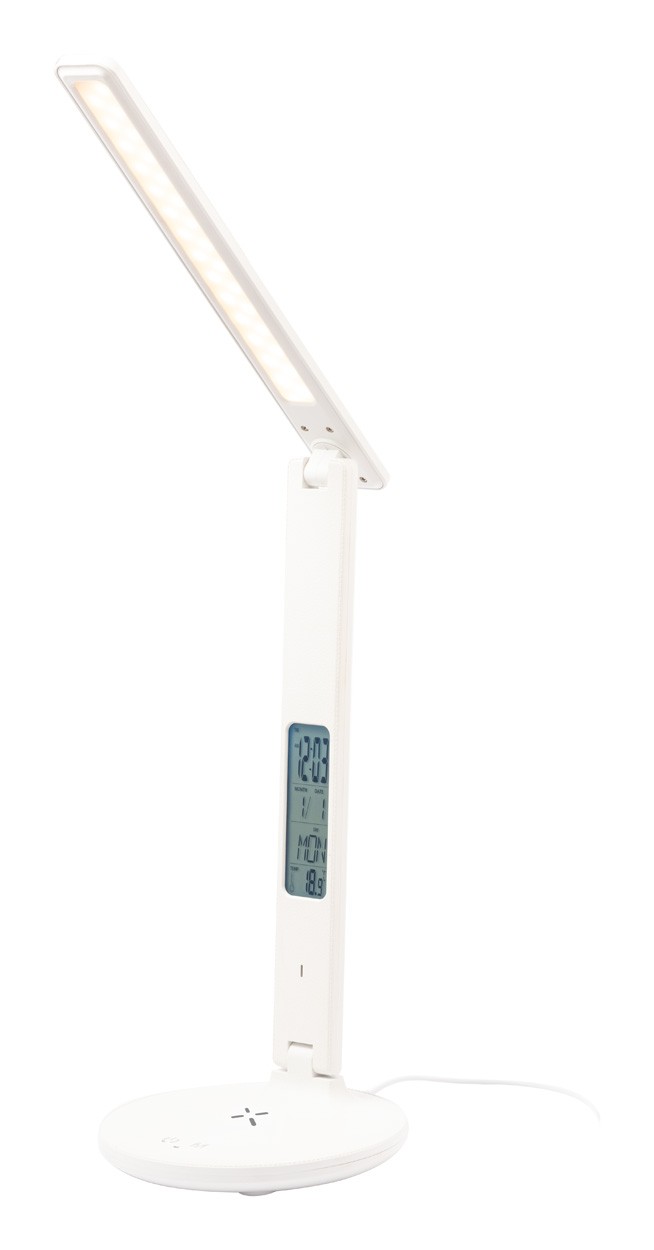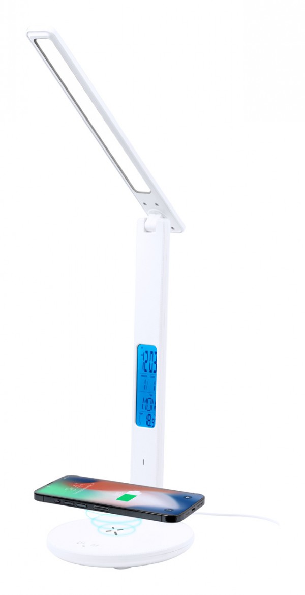 Foldable, aluminium and ABS plastic multifunctional desk lamp with built-in wireless fast charger (10W). With 60 LEDs, 3 light modes, adjustable brightness and height. Including USB charger cable.