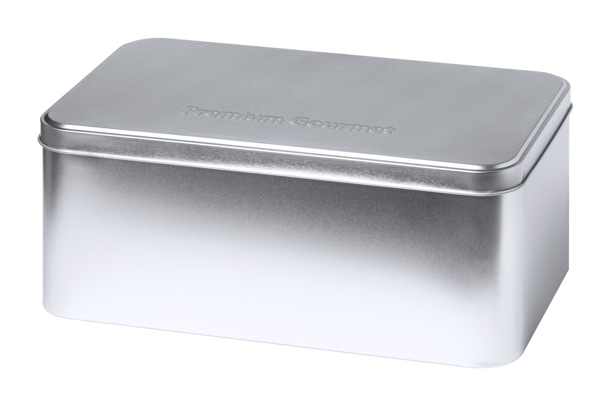Cutie cadou, dreptunghiulară, metalică, cu finisaj argintiu şi capac asortat.