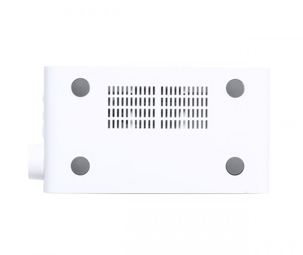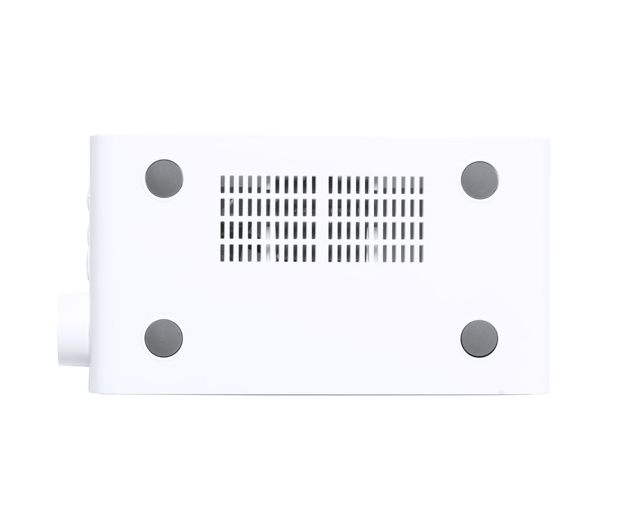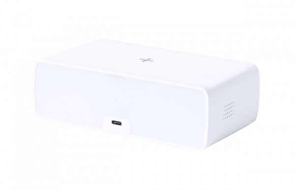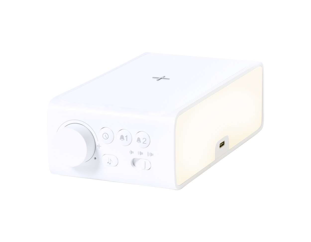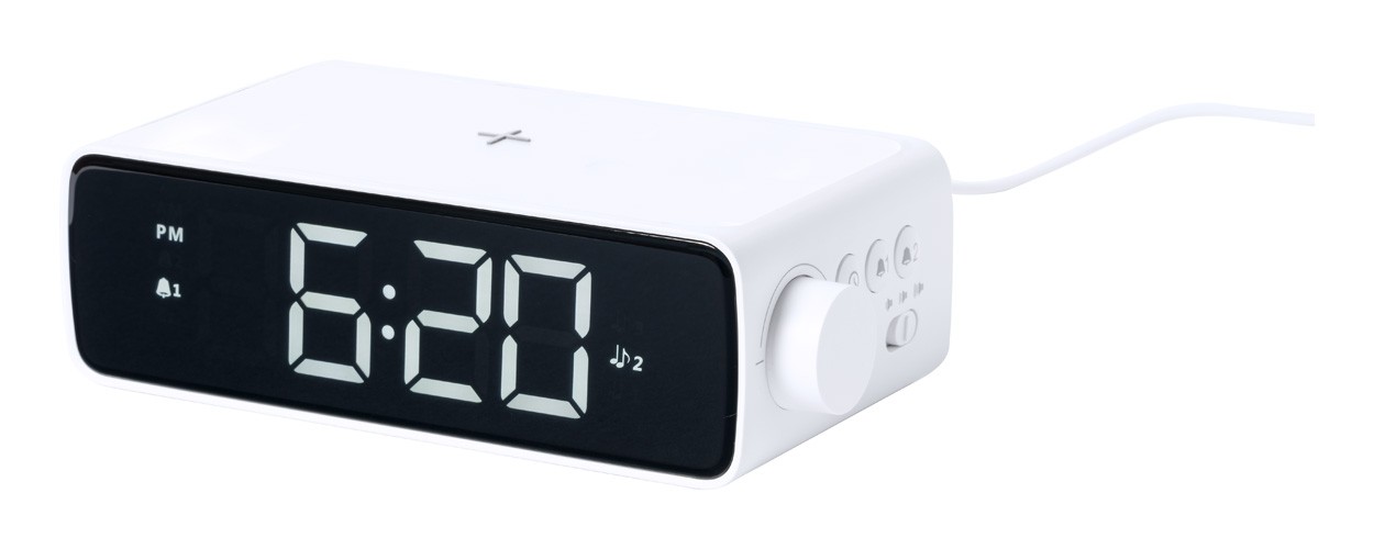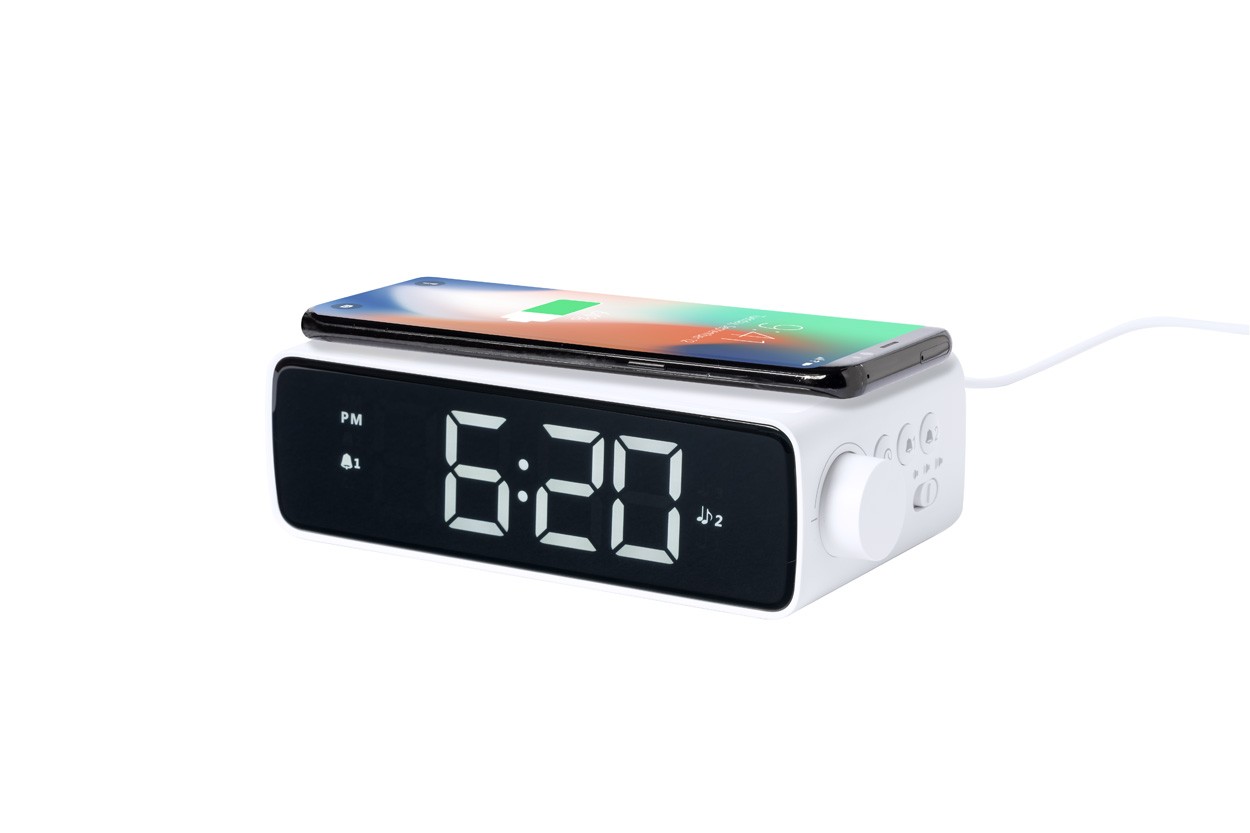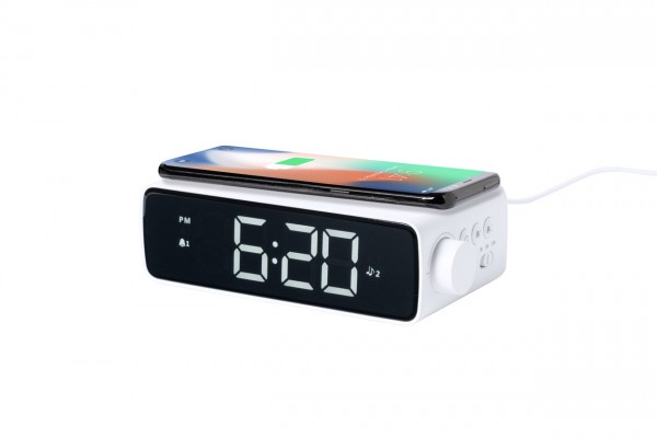 Multifunctional alarm clock in plastic housing with LED display and adjustable brightness, lamp, calendar and built-in wireless charger (10W). Including USB charger cable.