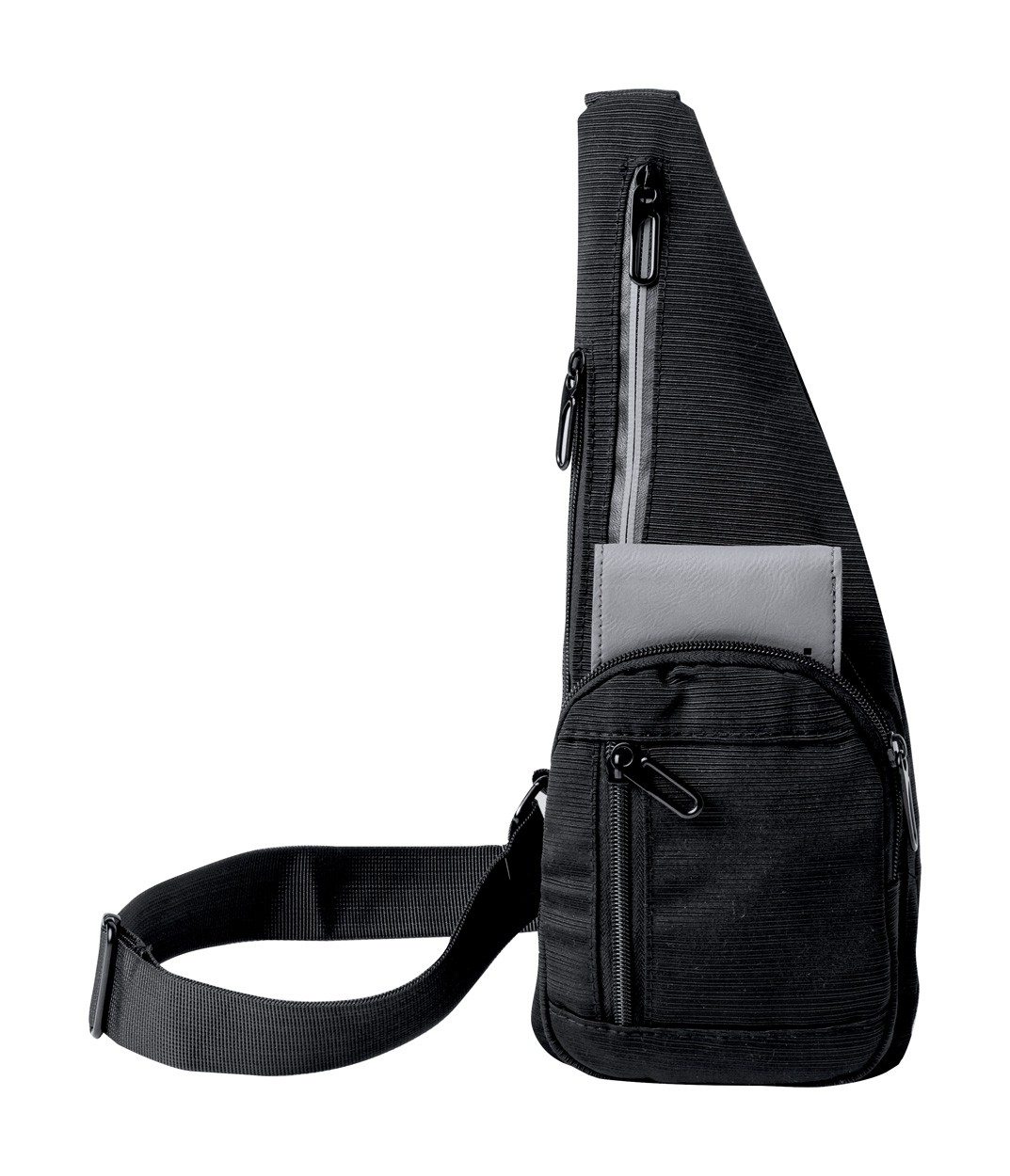 Polyester shoulder bag with zipped compartments, reflective strip and andjustable strap.