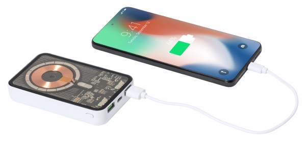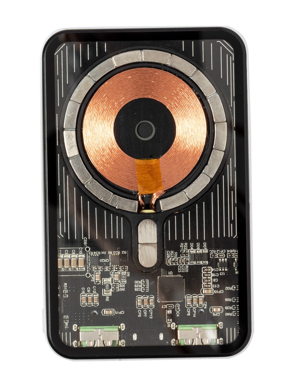 Baterie externă semi-transparentă, cu componente electronice vizibile, încărcător rapid wireless magnetic încorporat (15 W) și baterie de 5000 mAh. Cu 2 porturi USB și 1 USB-C pentru încărcător. Port de intrare USB-C. Compatibil cu iPhone® 12 sau mai nou. Inclusiv cablu de încărcare USB.