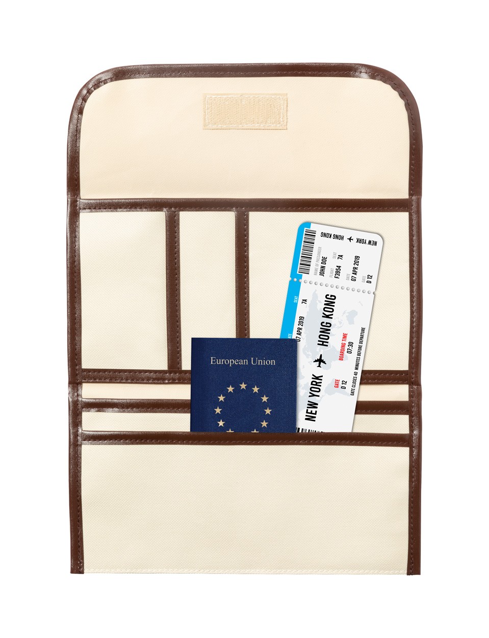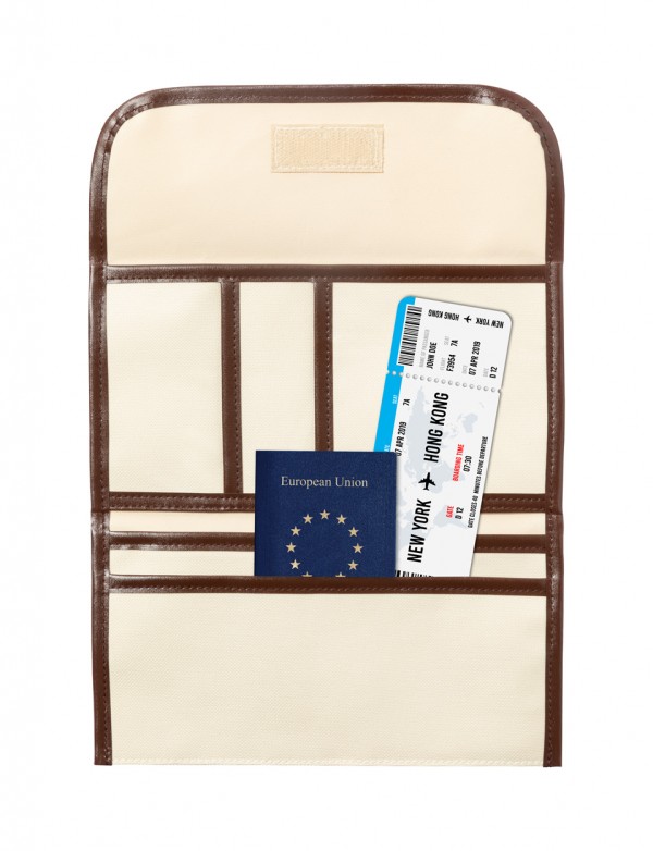Suport pentru documente de călătorie, din poliester 600D, cu mai multe compartimente, întărituri din piele PU și închidere cu velcro.