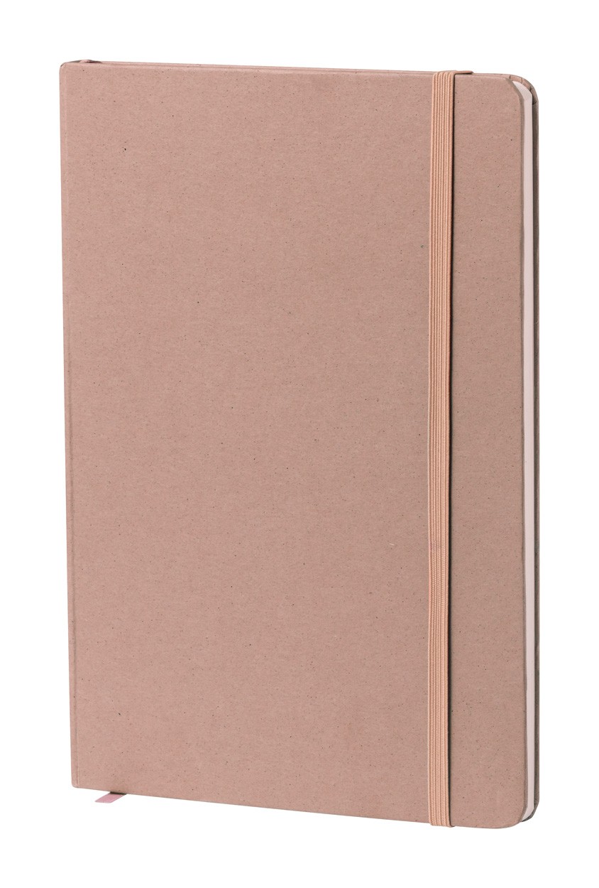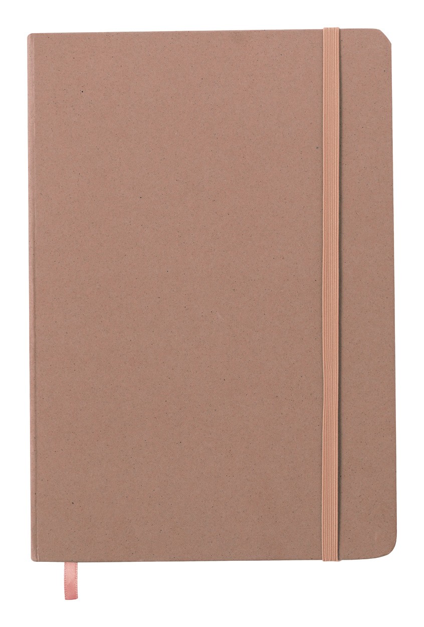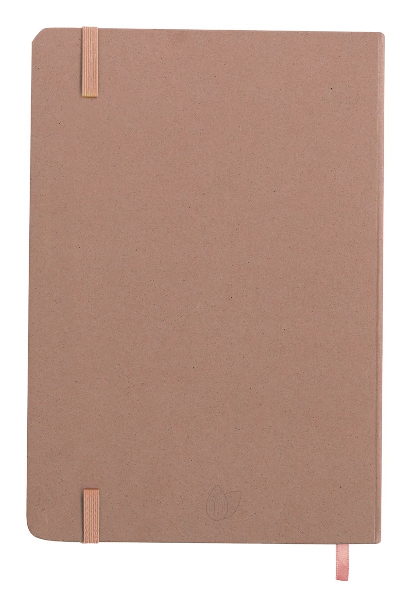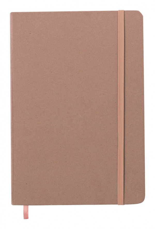 Agendă cu copertă din hârtie de fructe, cu 80 de foi dictando din hârtie reciclată. Cu marcaj și curea de cauciuc. Dimensiune A5.