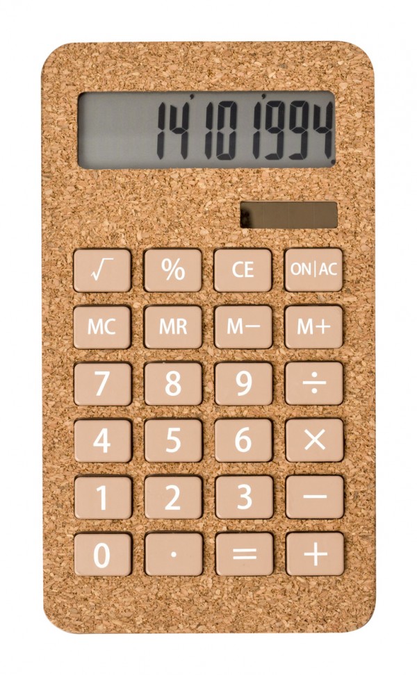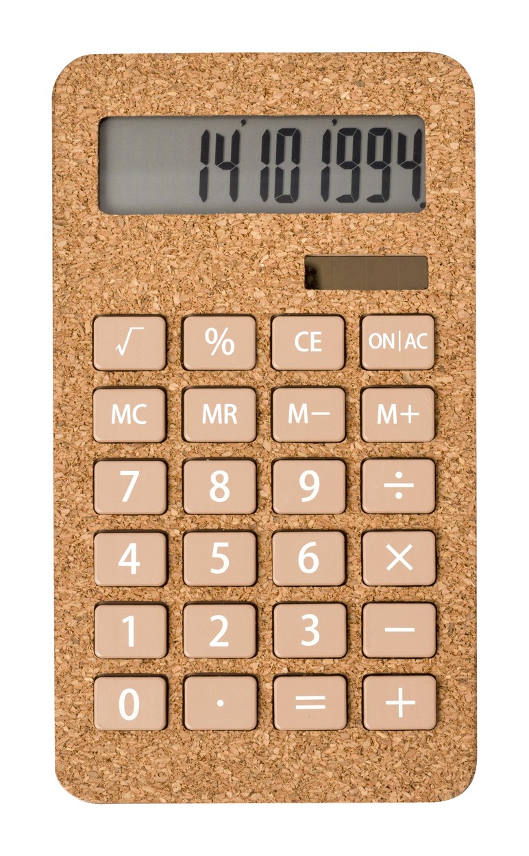 Calculator alimentat solar, cu 10 cifre, în carcasă din plută naturală și plastic. Inclusiv baterie tip buton.