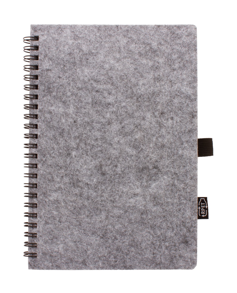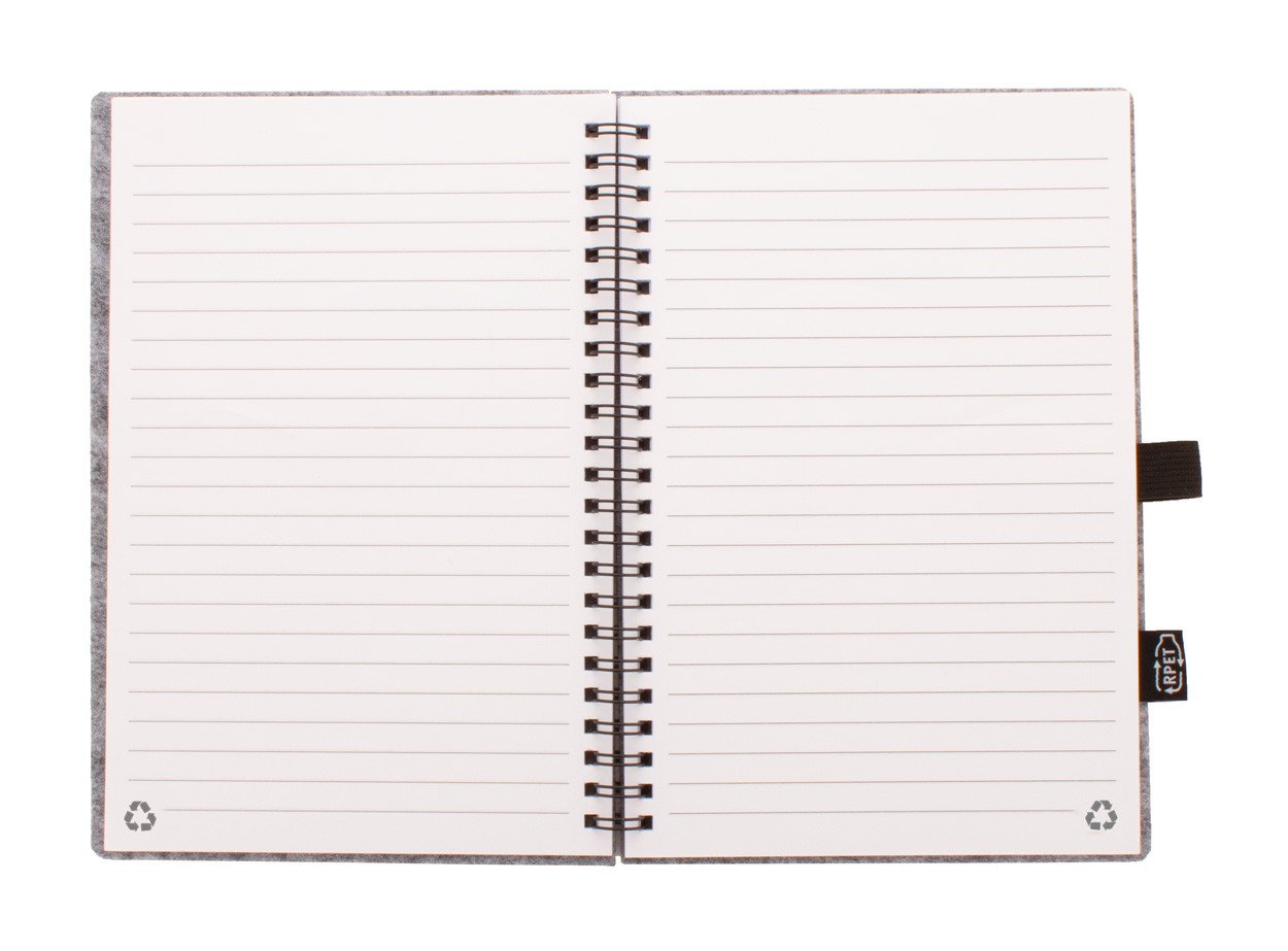 Caiet cu spirală, acoperit cu pâslă RPET, cu etichetă distinctă RPET și 80 de foi dictando din hârtie reciclată. Dimensiune A5.