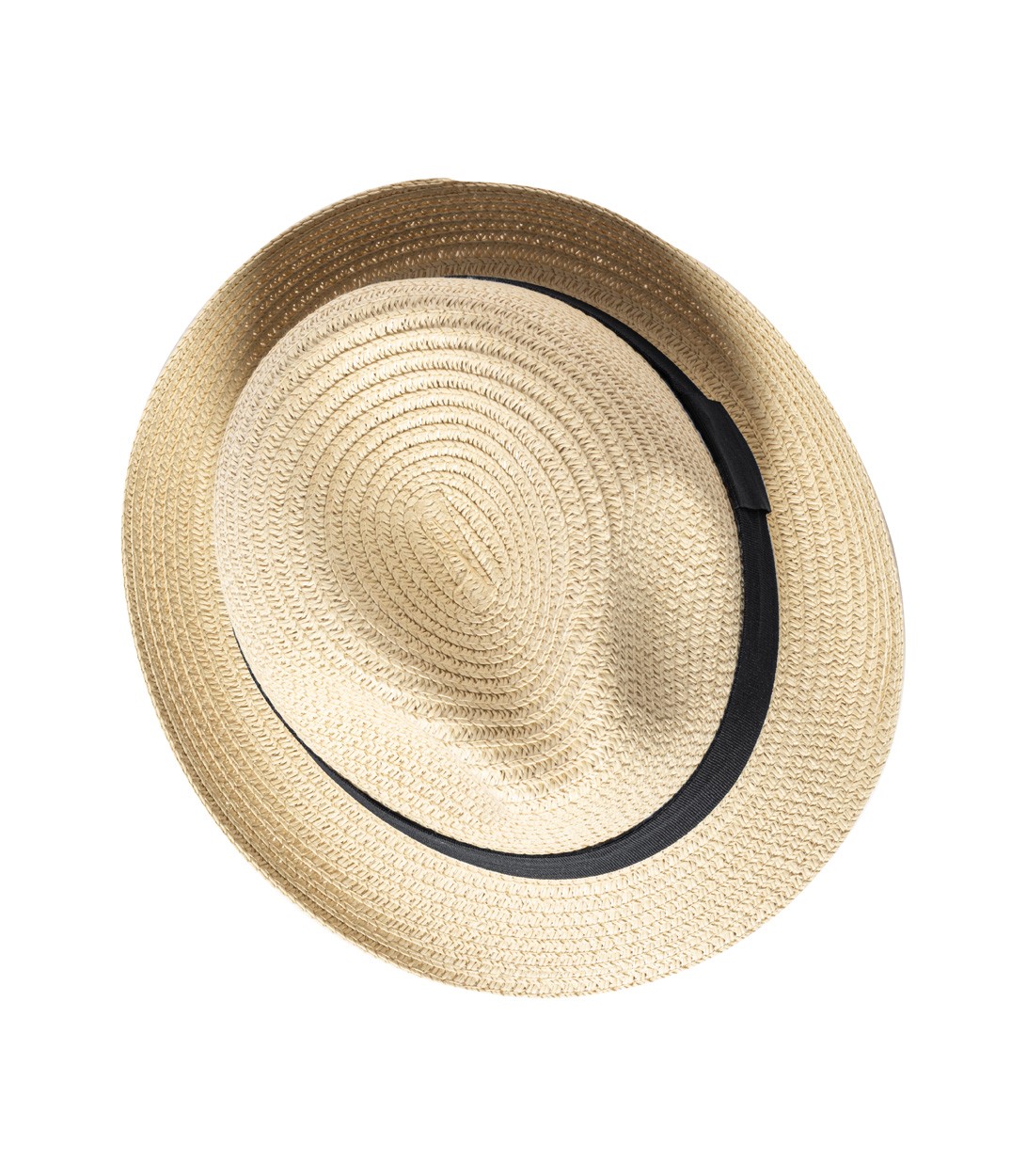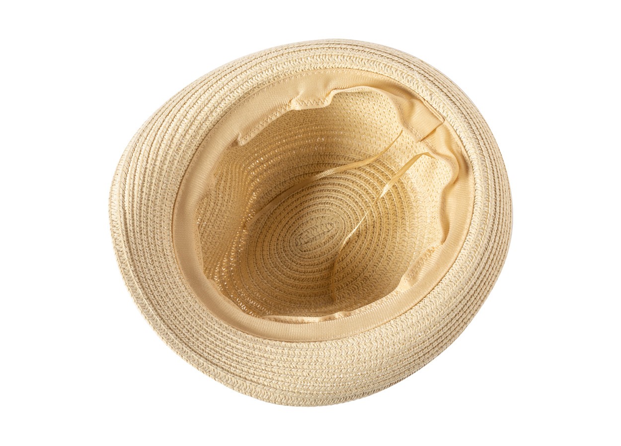 Pălărie unisex din paie din fibră sintetică cu bandă decorativă și bandă interioară reglabilă.