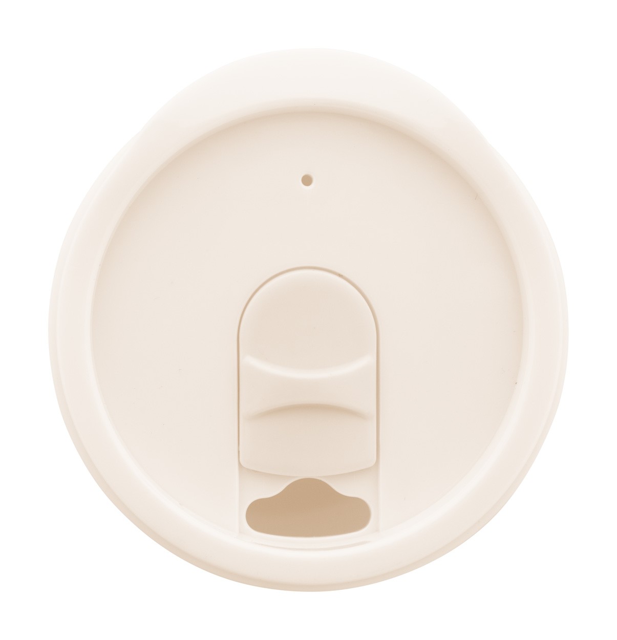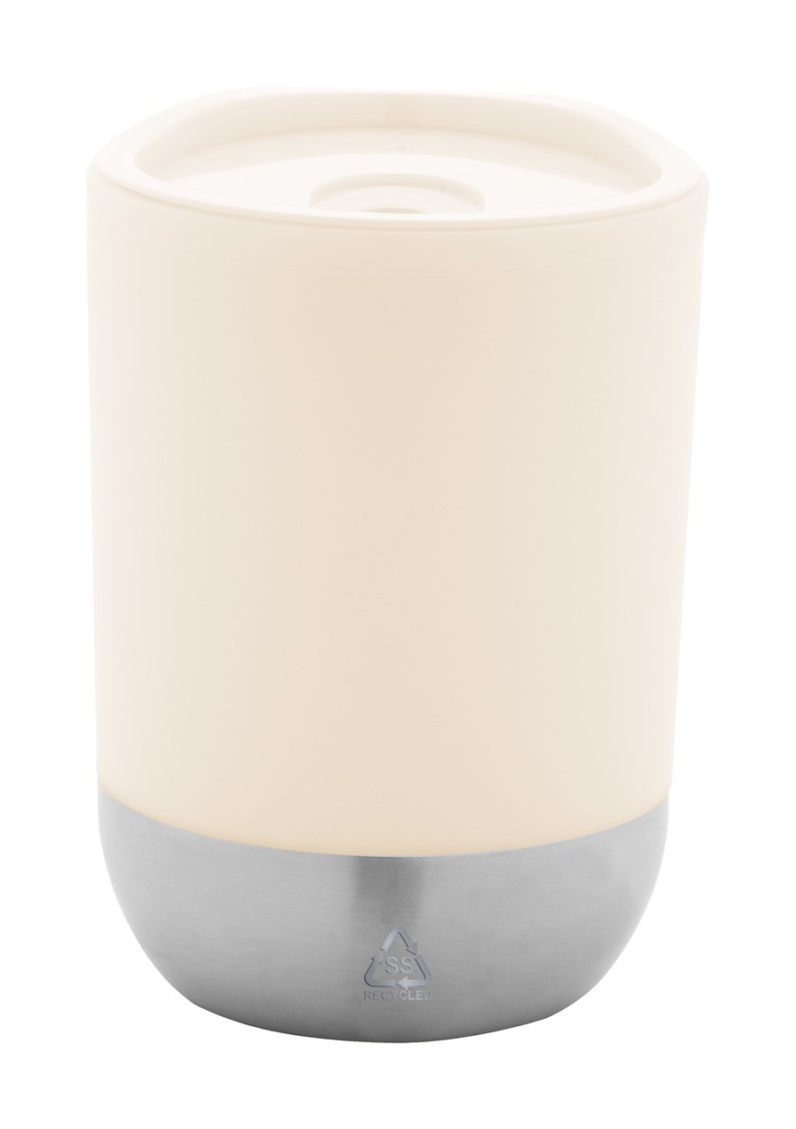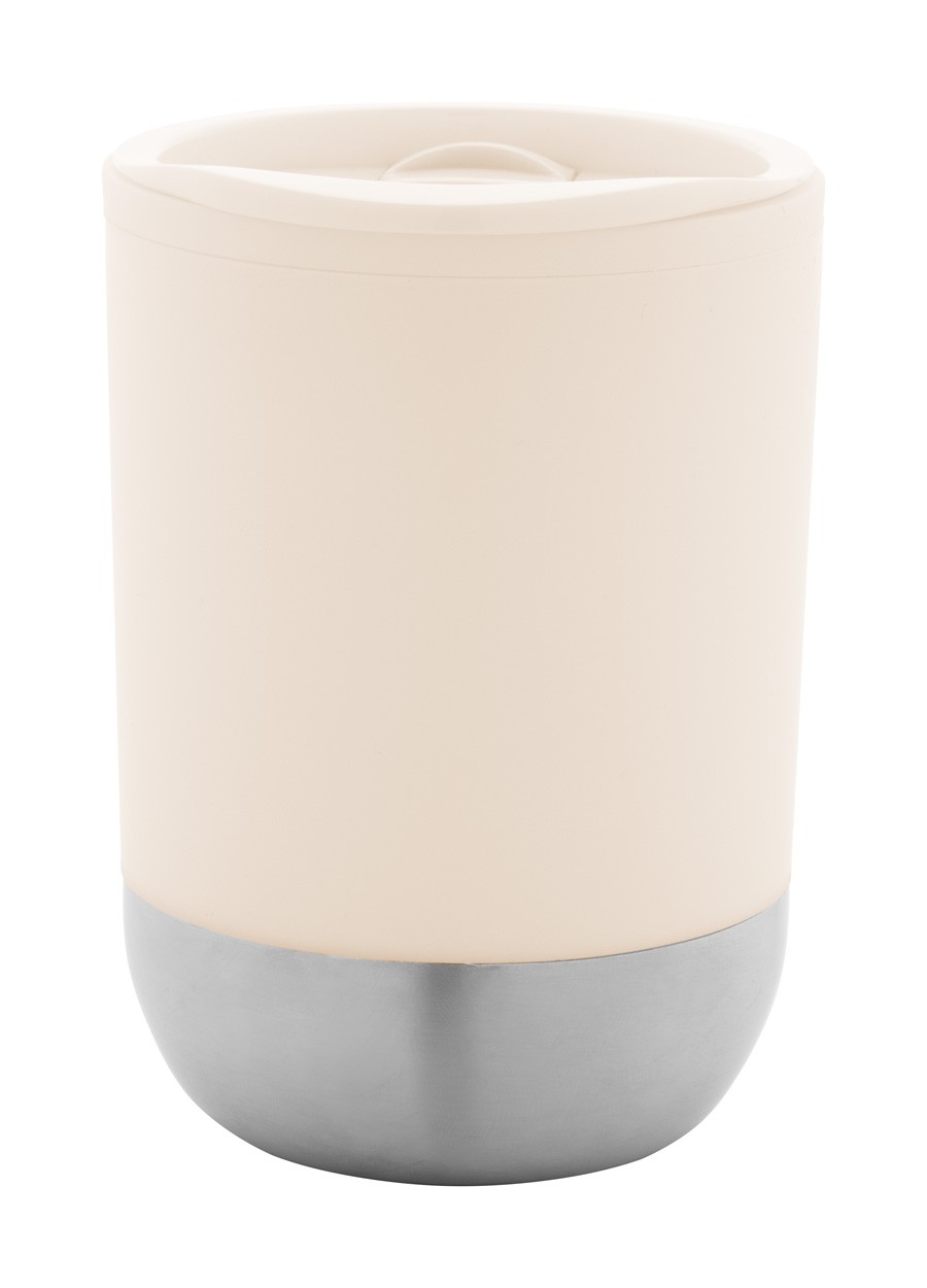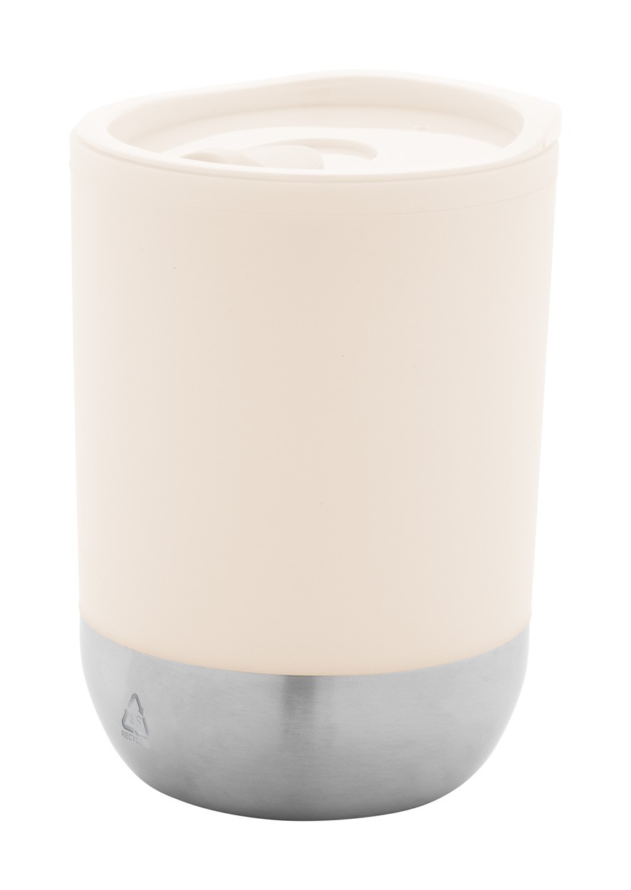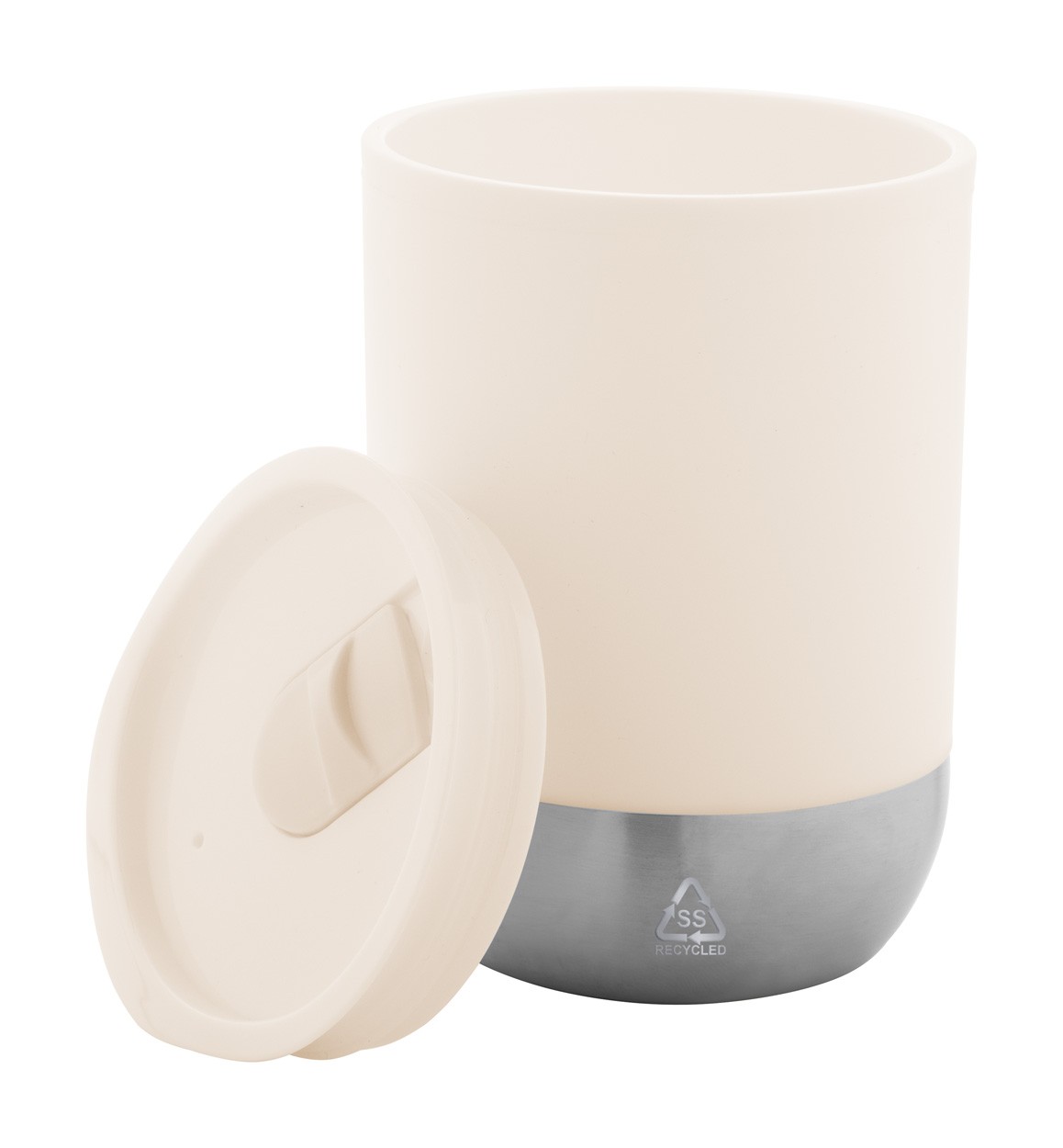Cană termoizolată, din plastic PP cu perete dublu, cu bază din oțel inoxidabil reciclat și capac pentru băut. 300 ml.