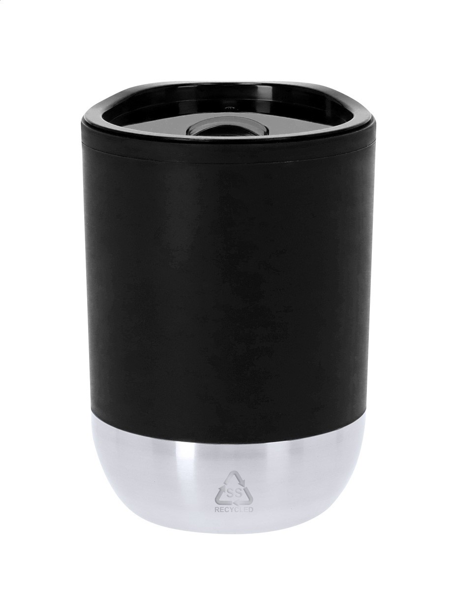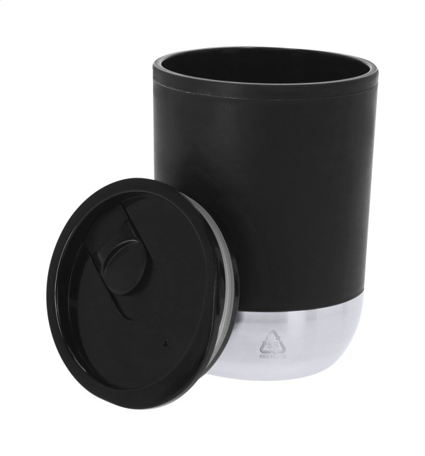 Cană termoizolată, din plastic PP cu perete dublu, cu bază din oțel inoxidabil reciclat și capac pentru băut. 300 ml.