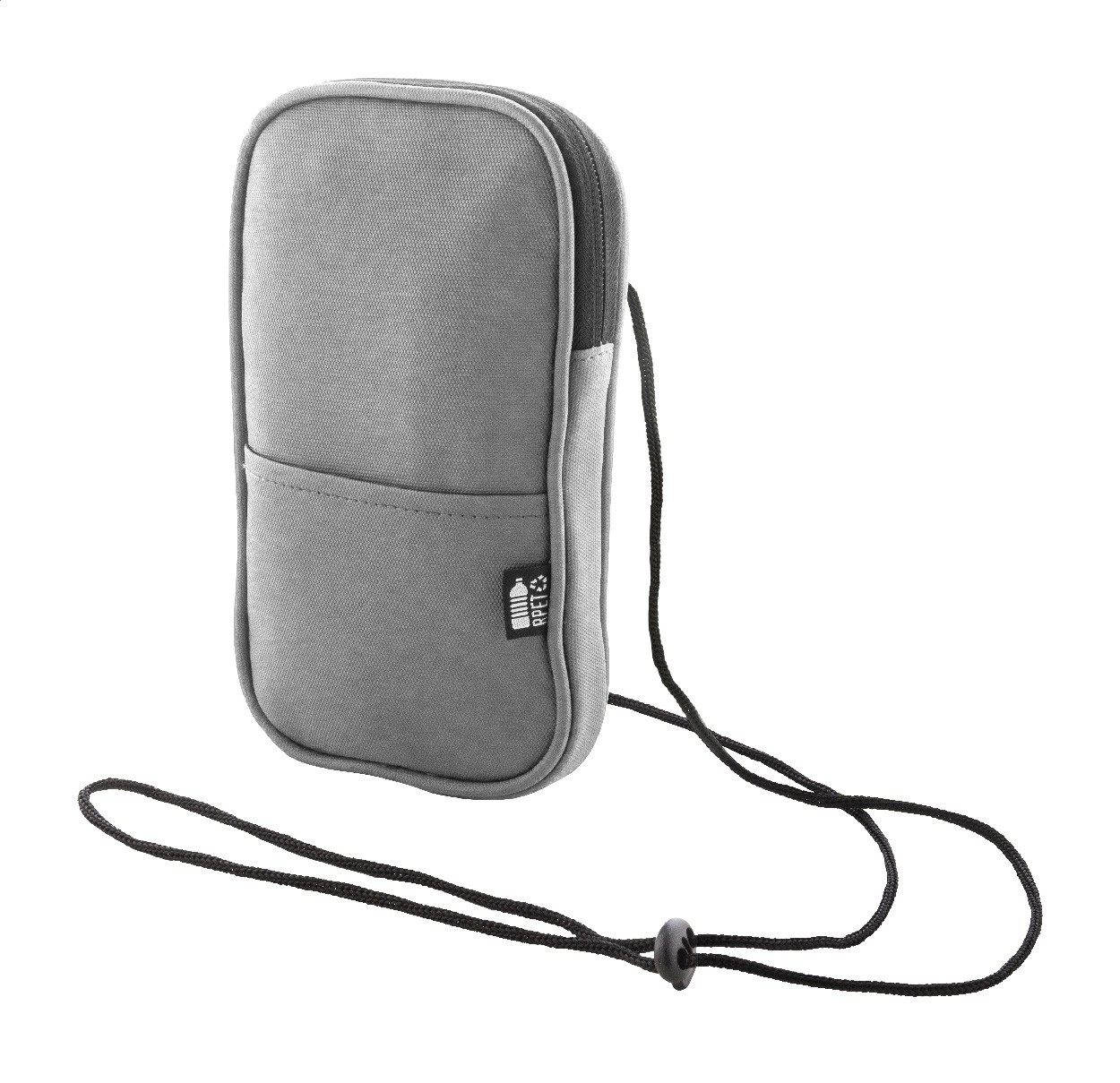 Geantă pentru telefon mobil, crossbody, impermeabilă din RPET, cu compartiment principal cu fermoar, buzunar frontal și șnur reglabil. Poliester RPET 600D acoperit cu PU, cu etichetă distinctivă RPET.