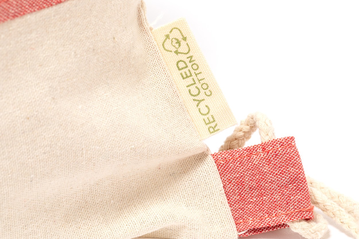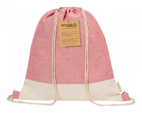Rucsac bicolor, din bumbac reciclat, cu șnur, cu etichetă distinctivă din bumbac reciclat. 100% bumbac reciclat, 120 g/m².