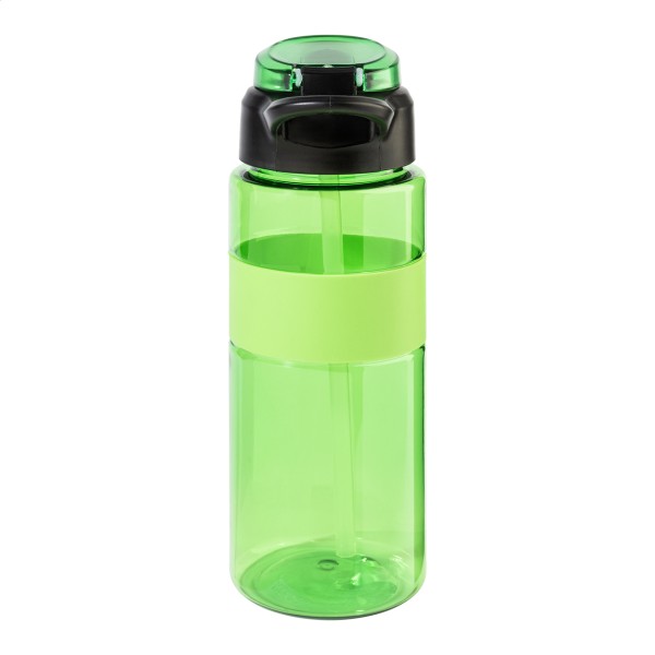 Sticlă sport RPET, cu mâner din silicon, capac cu deschidere automată și pai integrat, muștiuc din silicon și blocare de siguranță. 700 ml. Fără BPA. Nu este potrivită pentru băuturi carbogazoase.