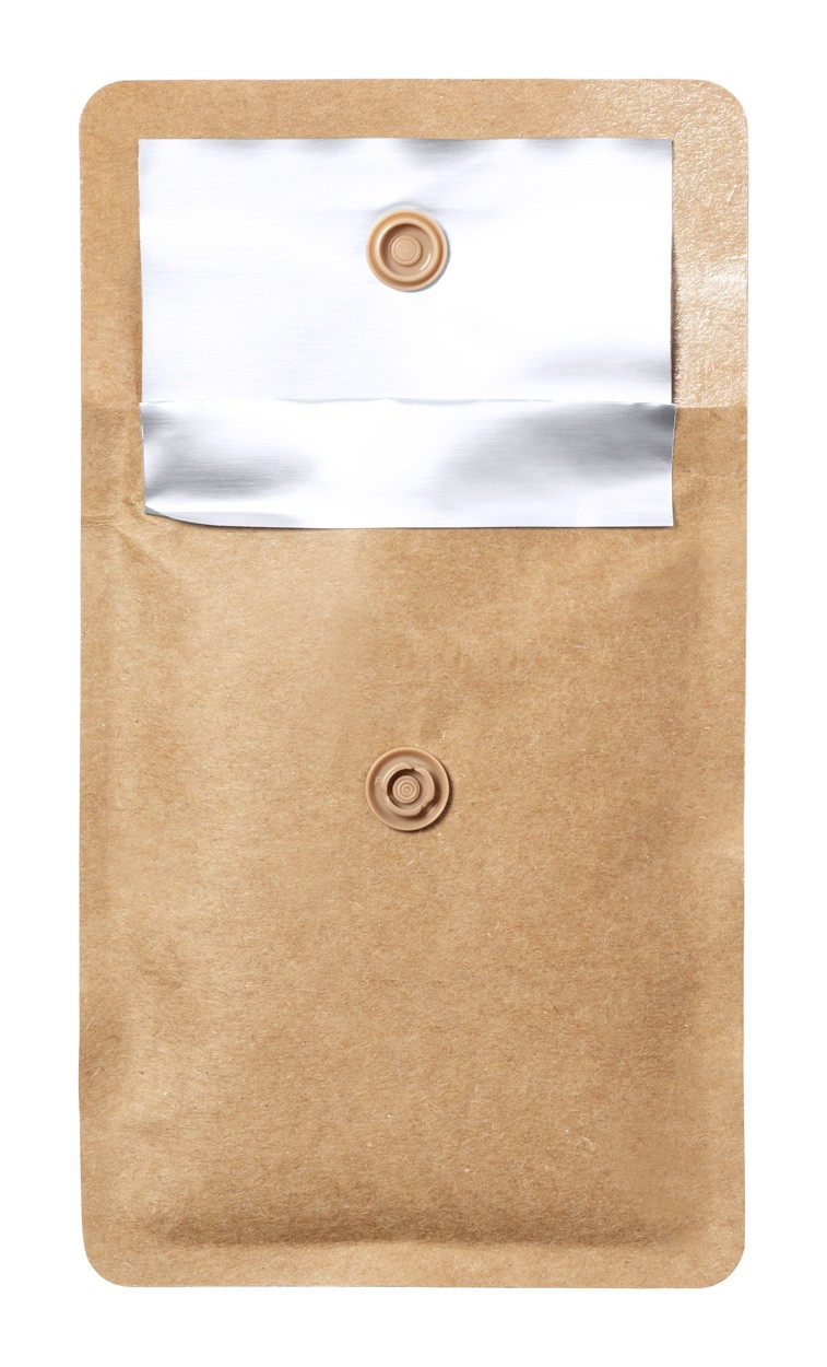 Scrumieră de buzunar, din hârtie reciclată laminată, cu interior din aluminiu ignifug și închidere cu capsă.