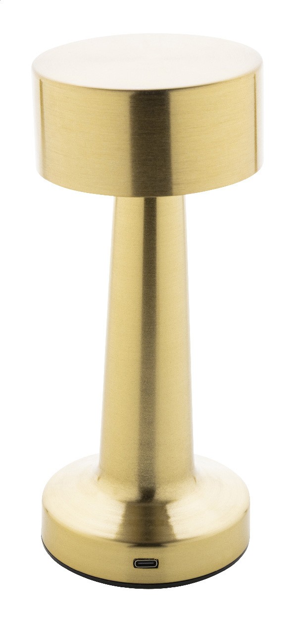 Lampă de masă din metal cu finisaj auriu, cu 24 de LED-uri, luminozitate reglabilă și baterie USB reîncărcabilă de 800 mAh. Cu moduri de lumină caldă, naturală și rece. Inclusiv cablu de încărcare USB.