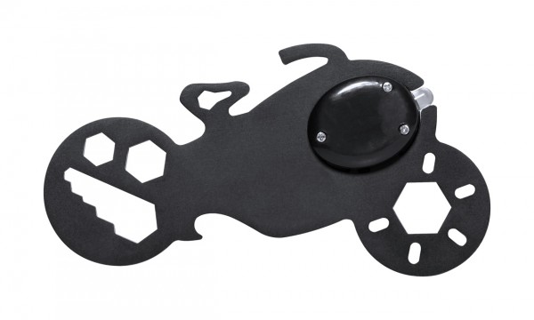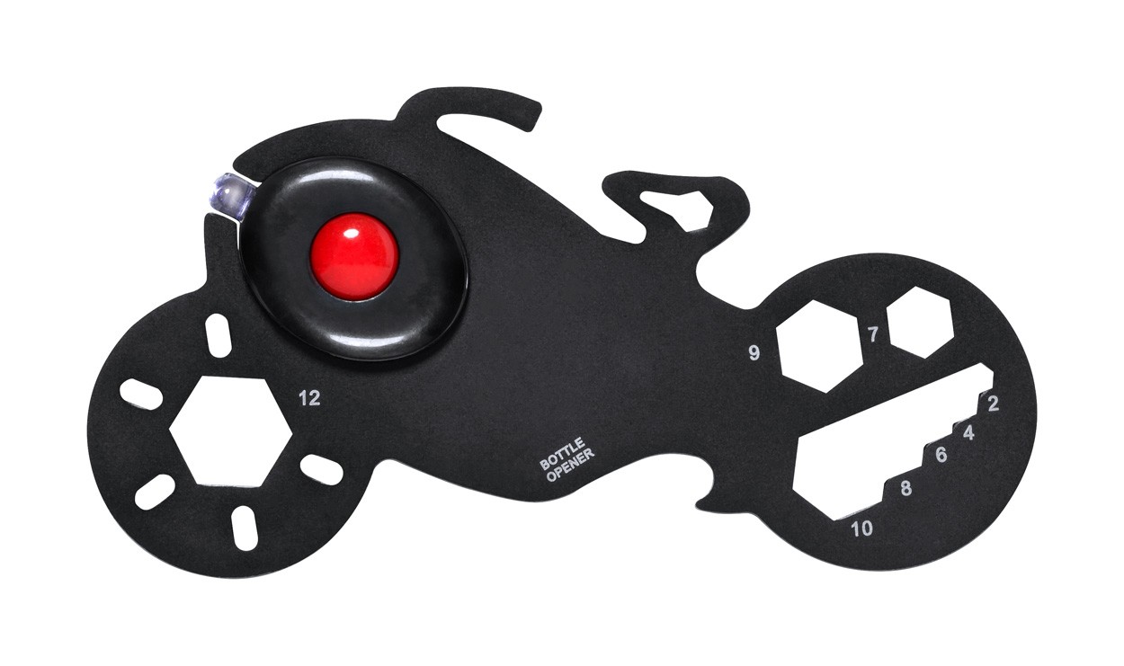 Motorbike shaped, stainless steel multitool with 11 functions and 1 LED light. Including button cell batteries.
