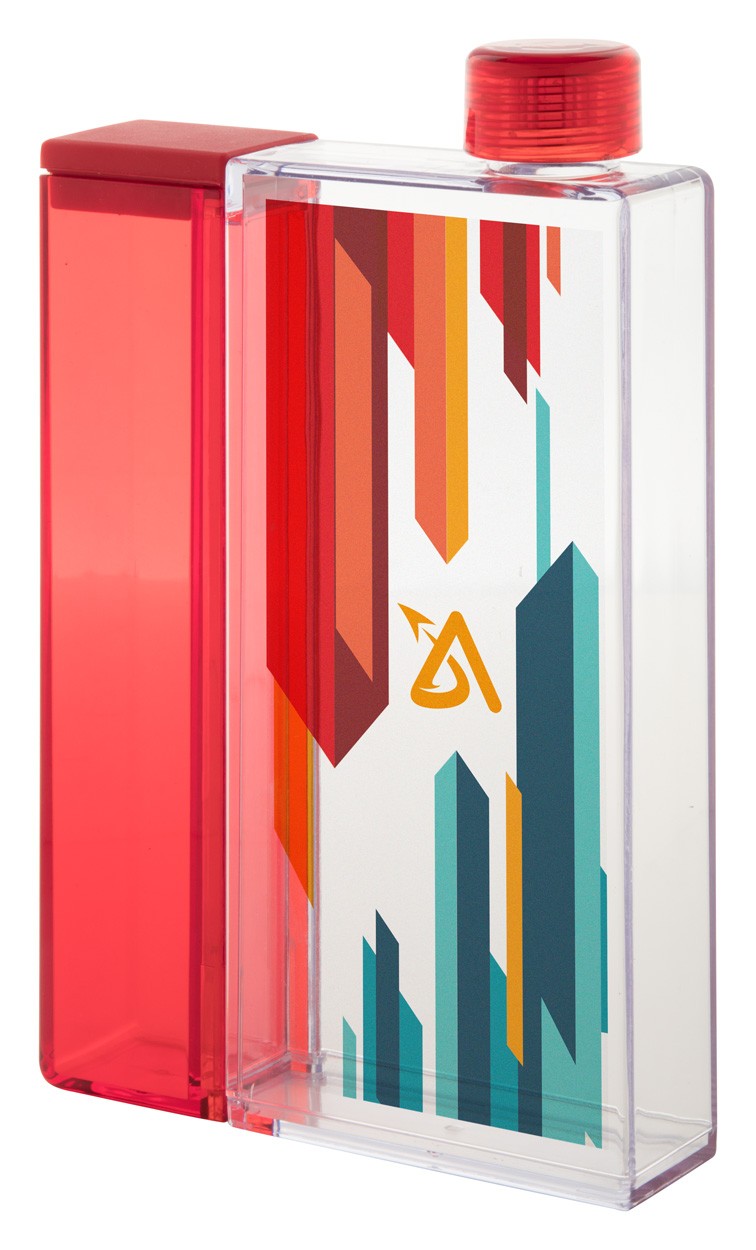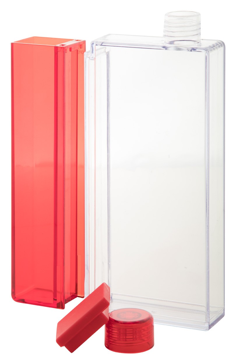 Sticlă dreptunghiulară transparentă din plastic cu compartiment detașabil. Capacitate: 320 ml / 125 ml. Nu este potrivit pentru băuturi carbogazoase.