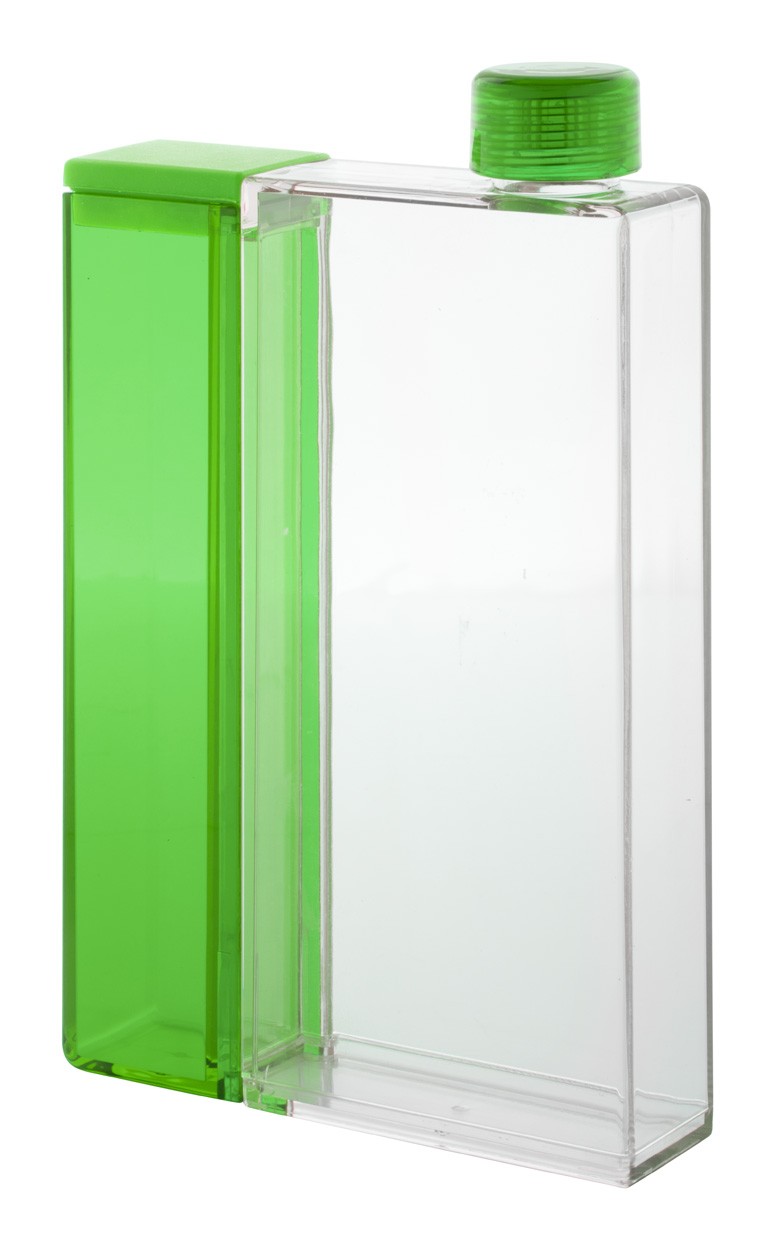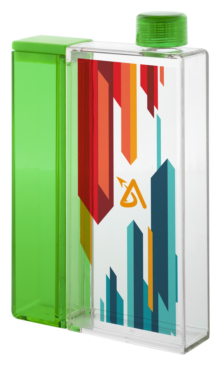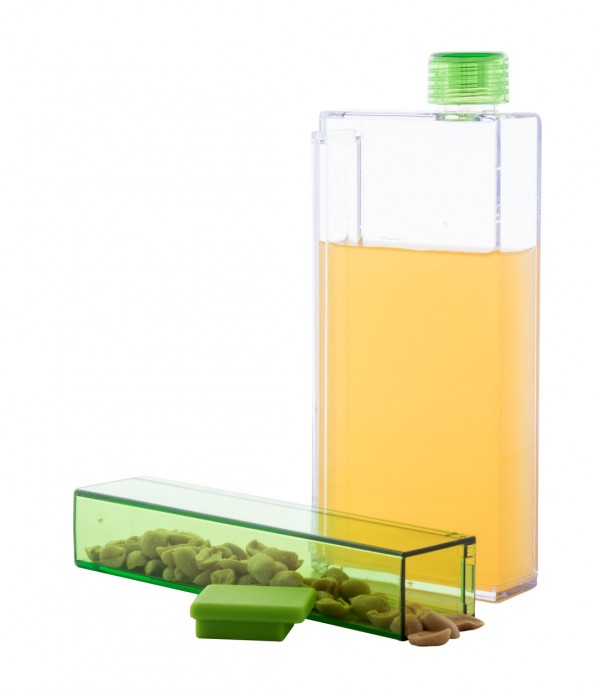 Sticlă dreptunghiulară transparentă din plastic cu compartiment detașabil. Capacitate: 320 ml / 125 ml. Nu este potrivit pentru băuturi carbogazoase.