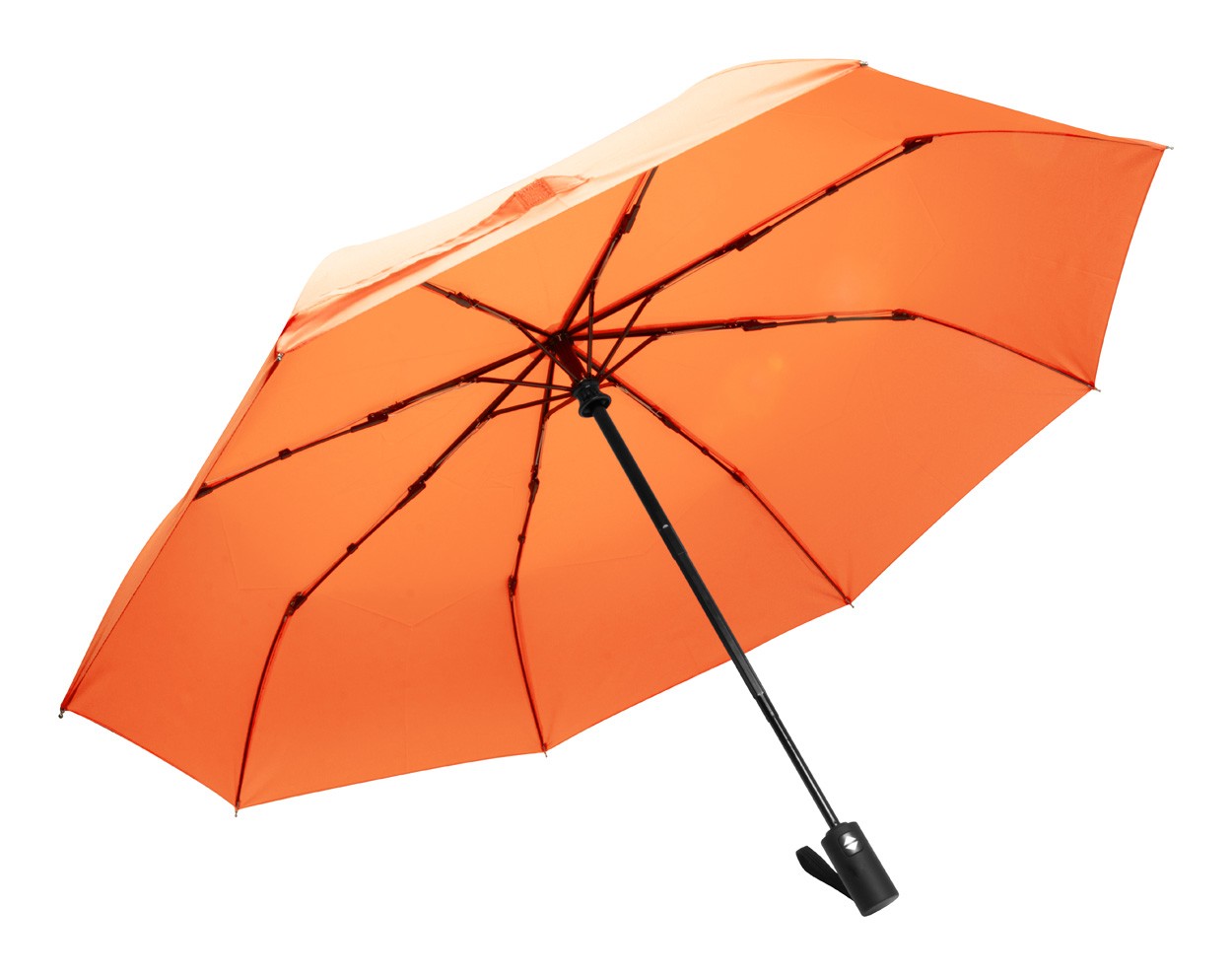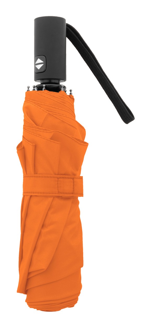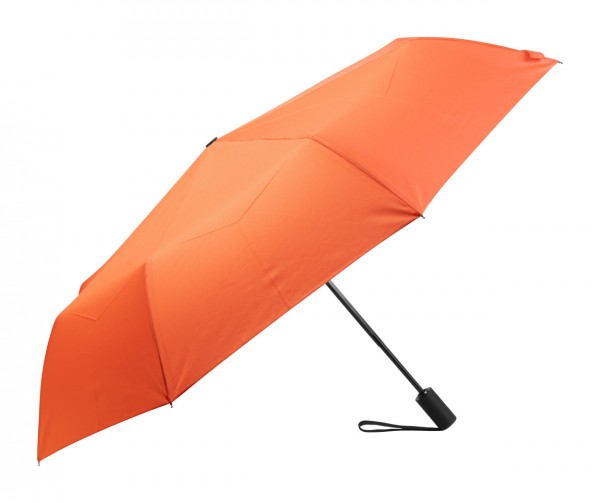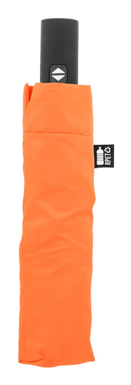 Umbrelă pliabilă, complet automată (deschidere/închidere), rezistentă la vânt, cu 8 panouri în husă de culoare asortată. Cu cadru metalic, nervuri din fibră de sticlă și mâner cauciucat. Pongee 190T RPET. Cu etichetă distinctivă RPET.
