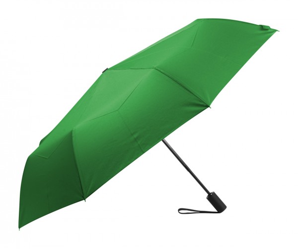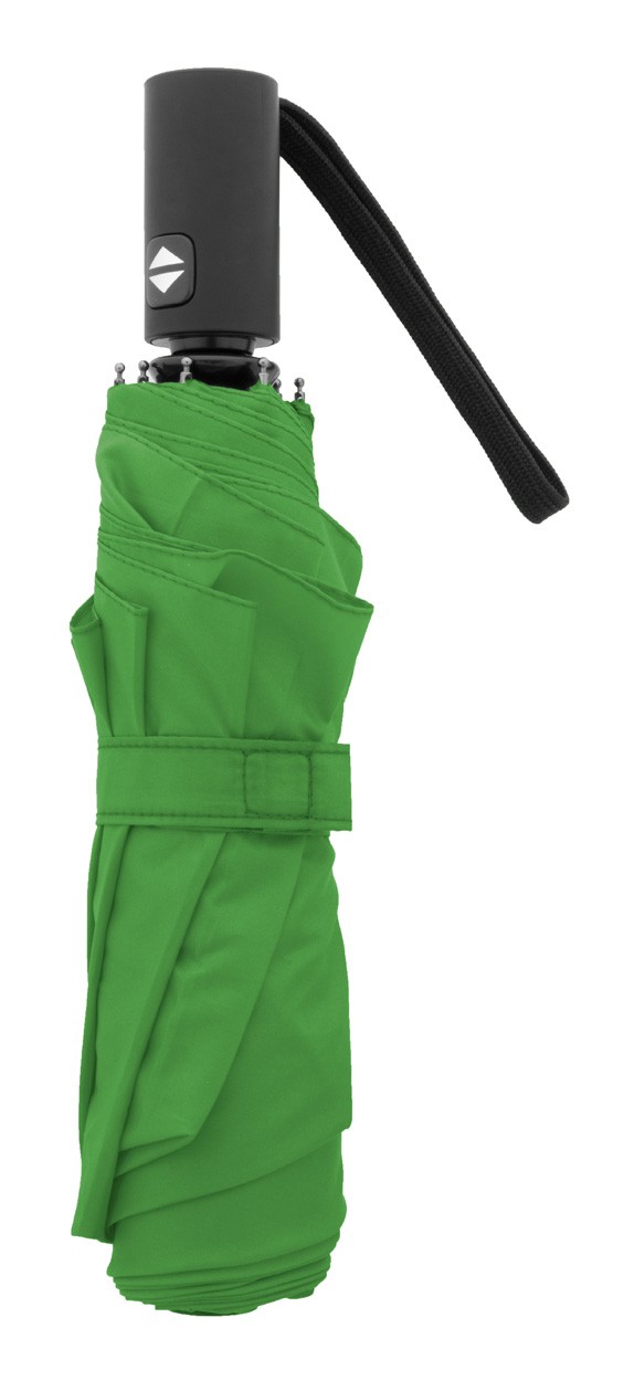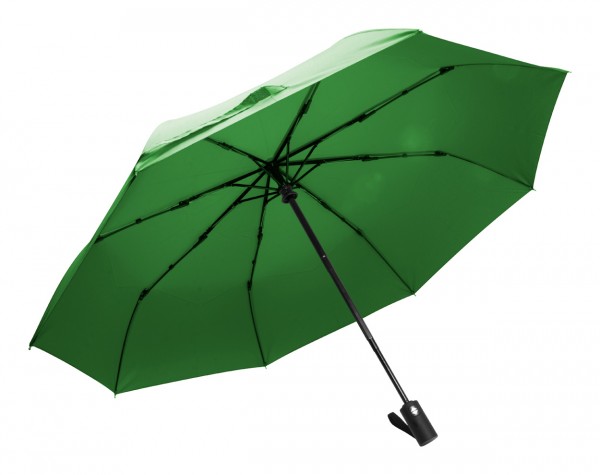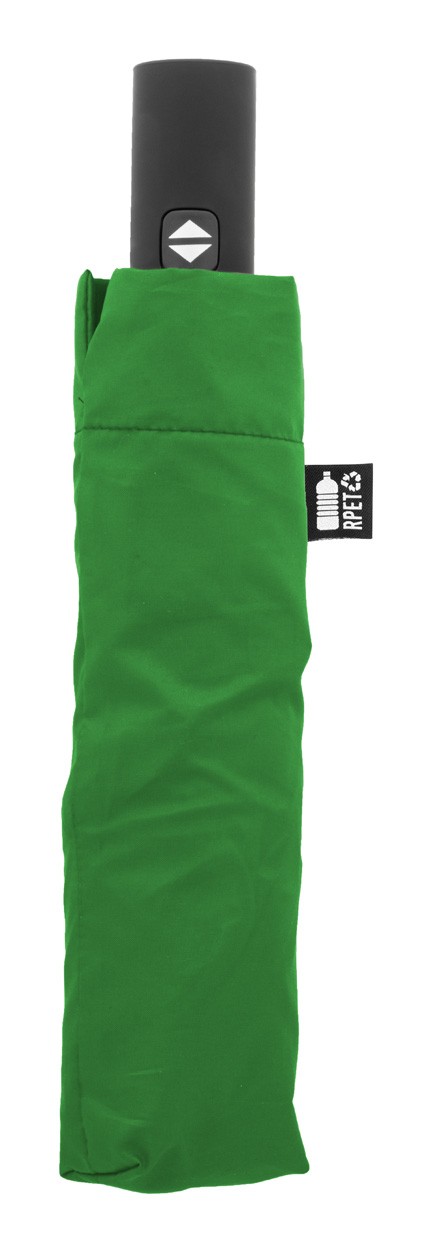 Umbrelă pliabilă, complet automată (deschidere/închidere), rezistentă la vânt, cu 8 panouri în husă de culoare asortată. Cu cadru metalic, nervuri din fibră de sticlă și mâner cauciucat. Pongee 190T RPET. Cu etichetă distinctivă RPET.