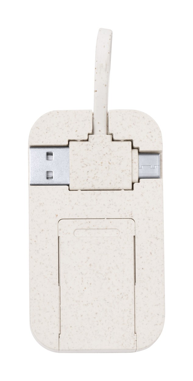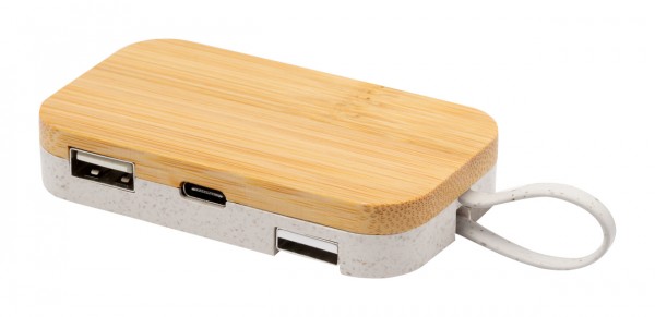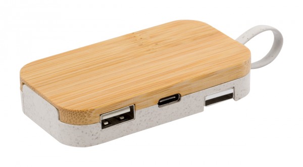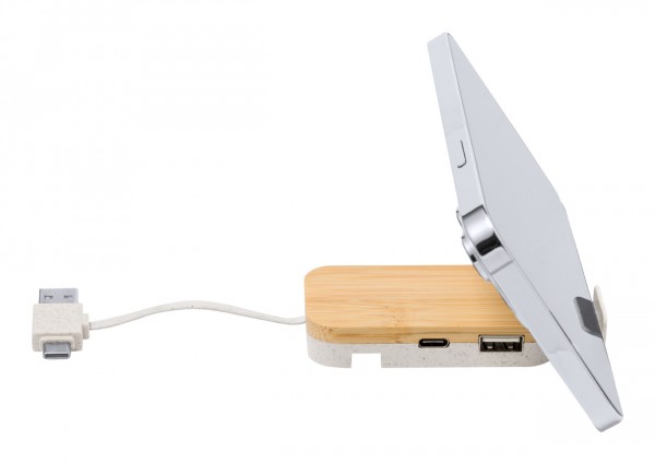 USB hub in wheat straw plastic and bamboo, with mobile holder function. With 2 USB and 1 USB-C ports, USB 2.0. Including cable with USB and USB-C connections.