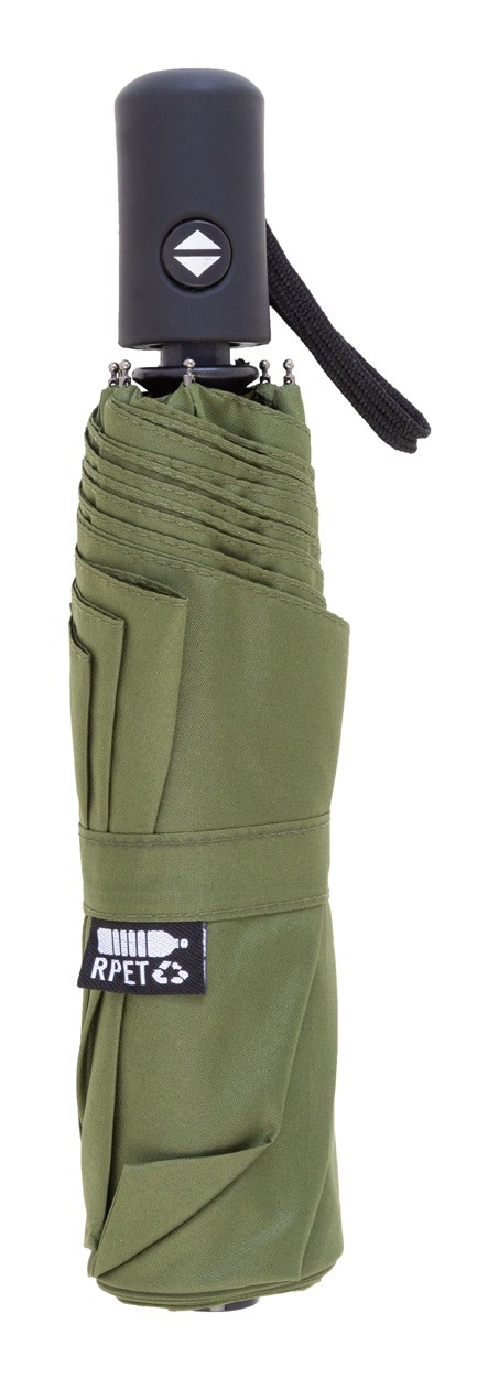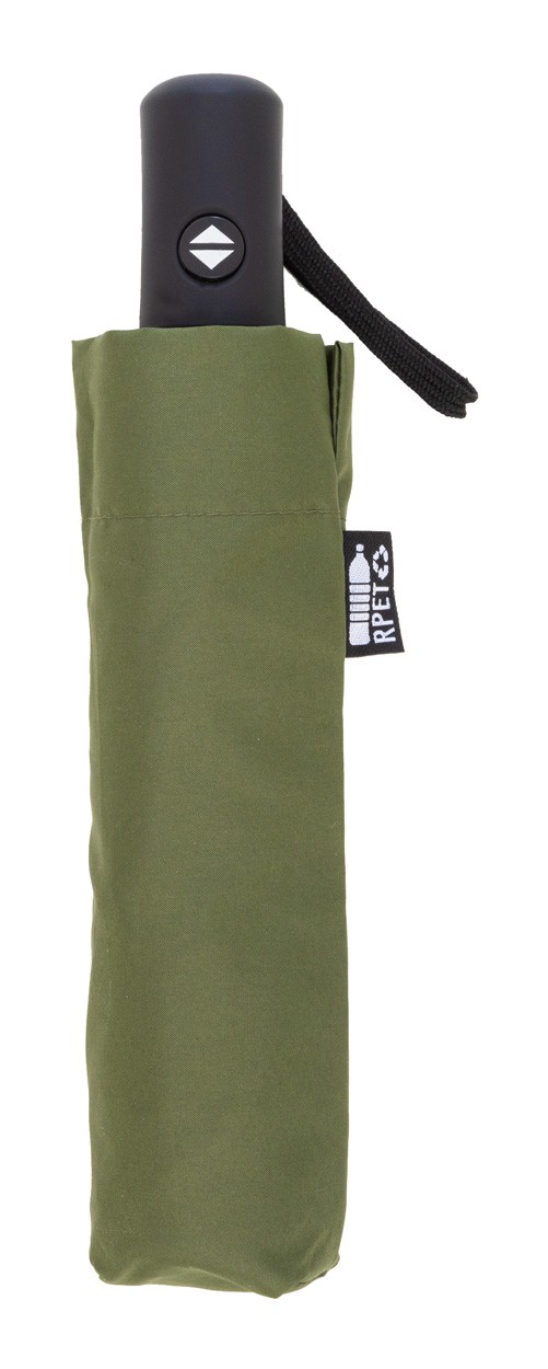 Umbrelă pliabilă, complet automată (deschidere/închidere), rezistentă la vânt, cu 8 panouri, în husă de culoare asortată. Cu cadru metalic, nervuri din fibră de sticlă și mâner cauciucat cu curea de mână. Pongee 190T RPET. Cu etichetă distinctivă RPET.