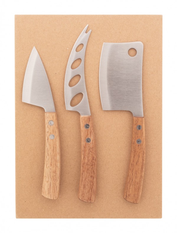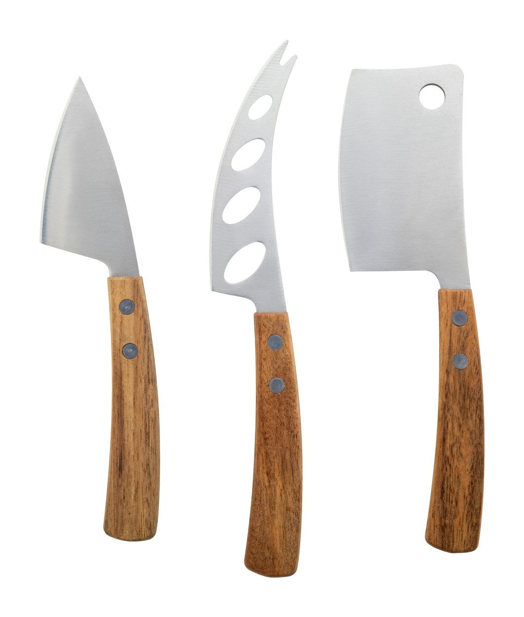 Set cuțite de brânză, din oțel inoxidabil, cu mânere din lemn de salcâm, 3 buc. În cutie în formă de carte din hârtie kraft.