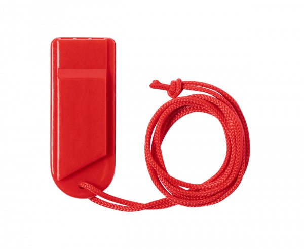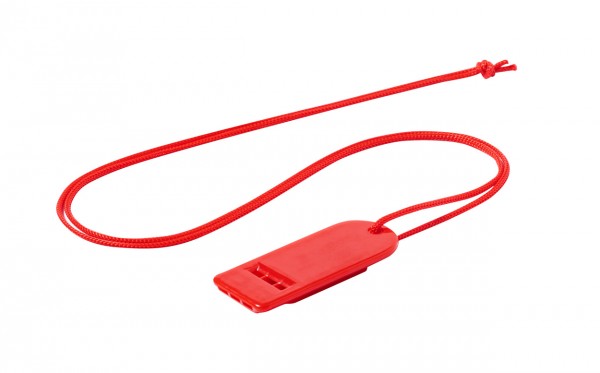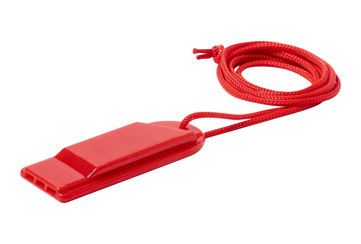 Fluier din plastic, cu șnur pentru gât de culoare asortată.