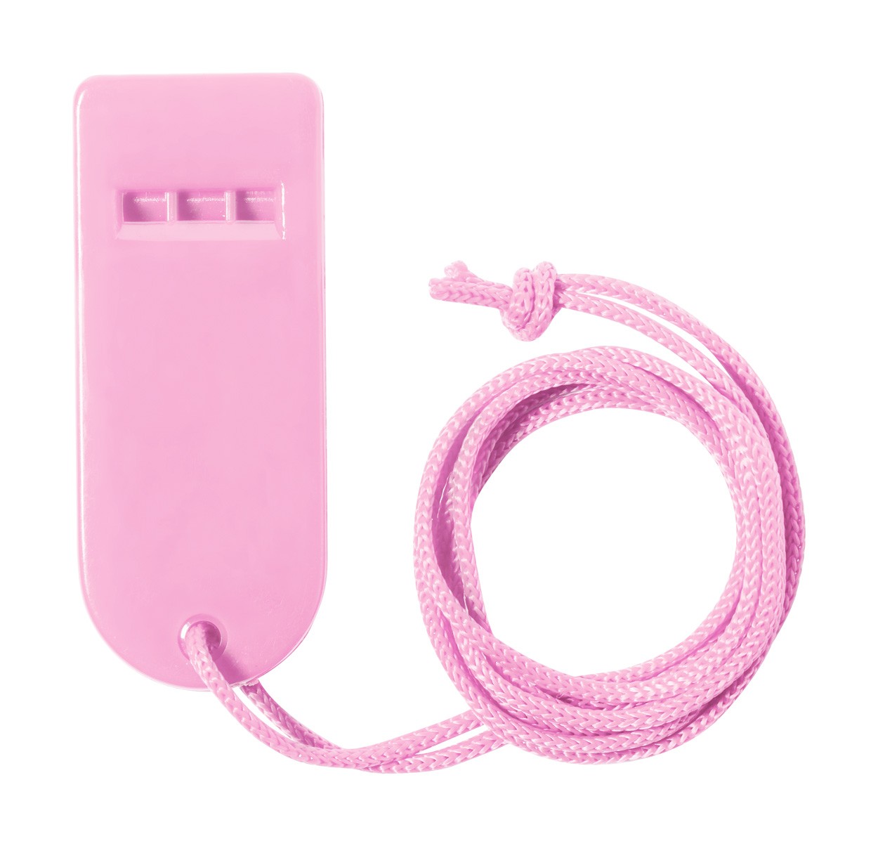Fluier din plastic, cu șnur pentru gât de culoare asortată.