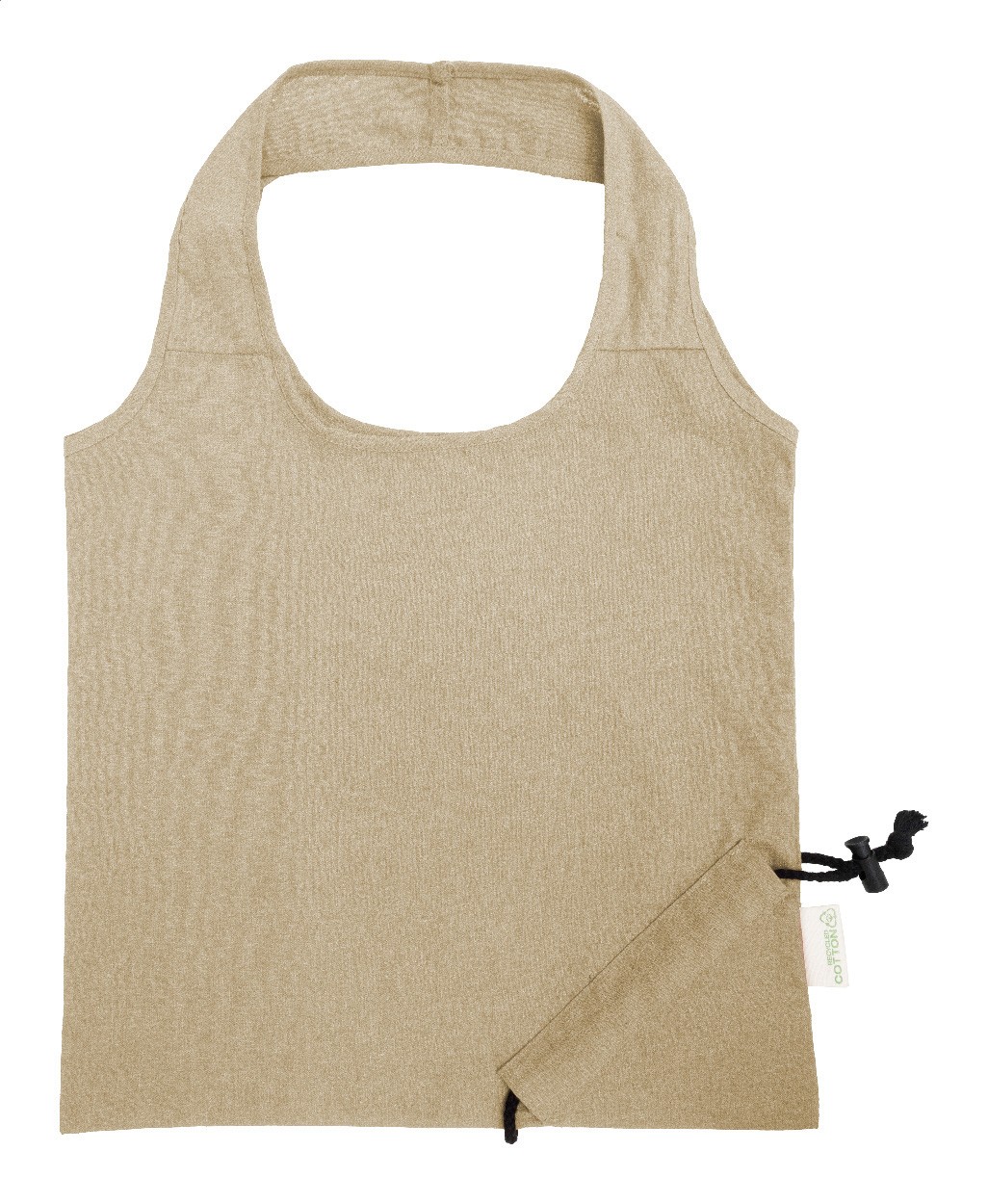 Sacoșă de cumpărături pliabilă, din 70% bumbac reciclat și 30% poliester RPET, 140 g/m². Cu etichetă distinctivă din bumbac reciclat.