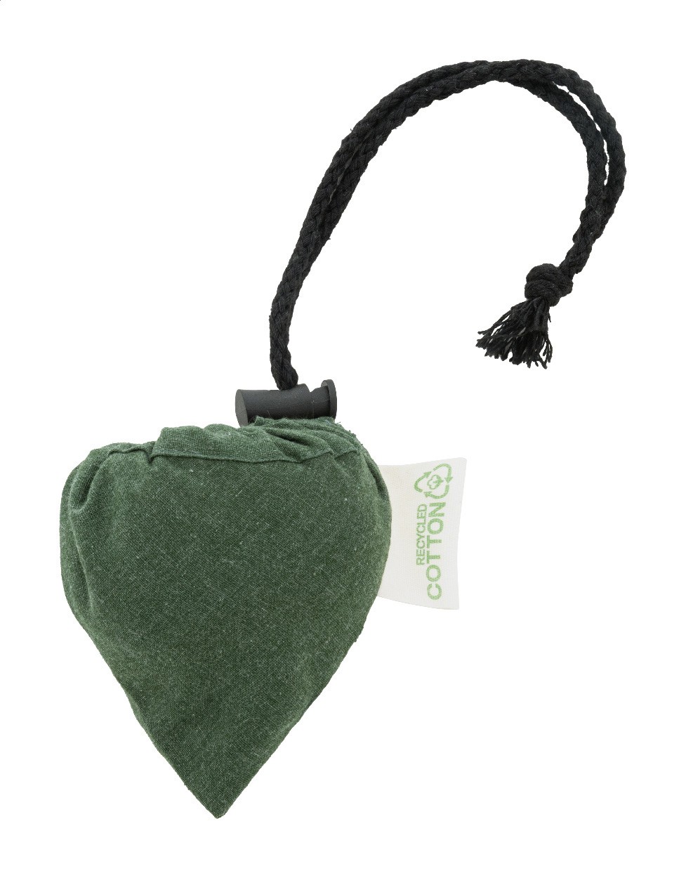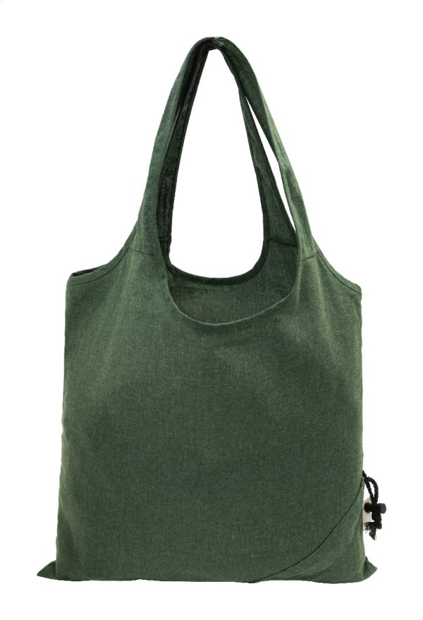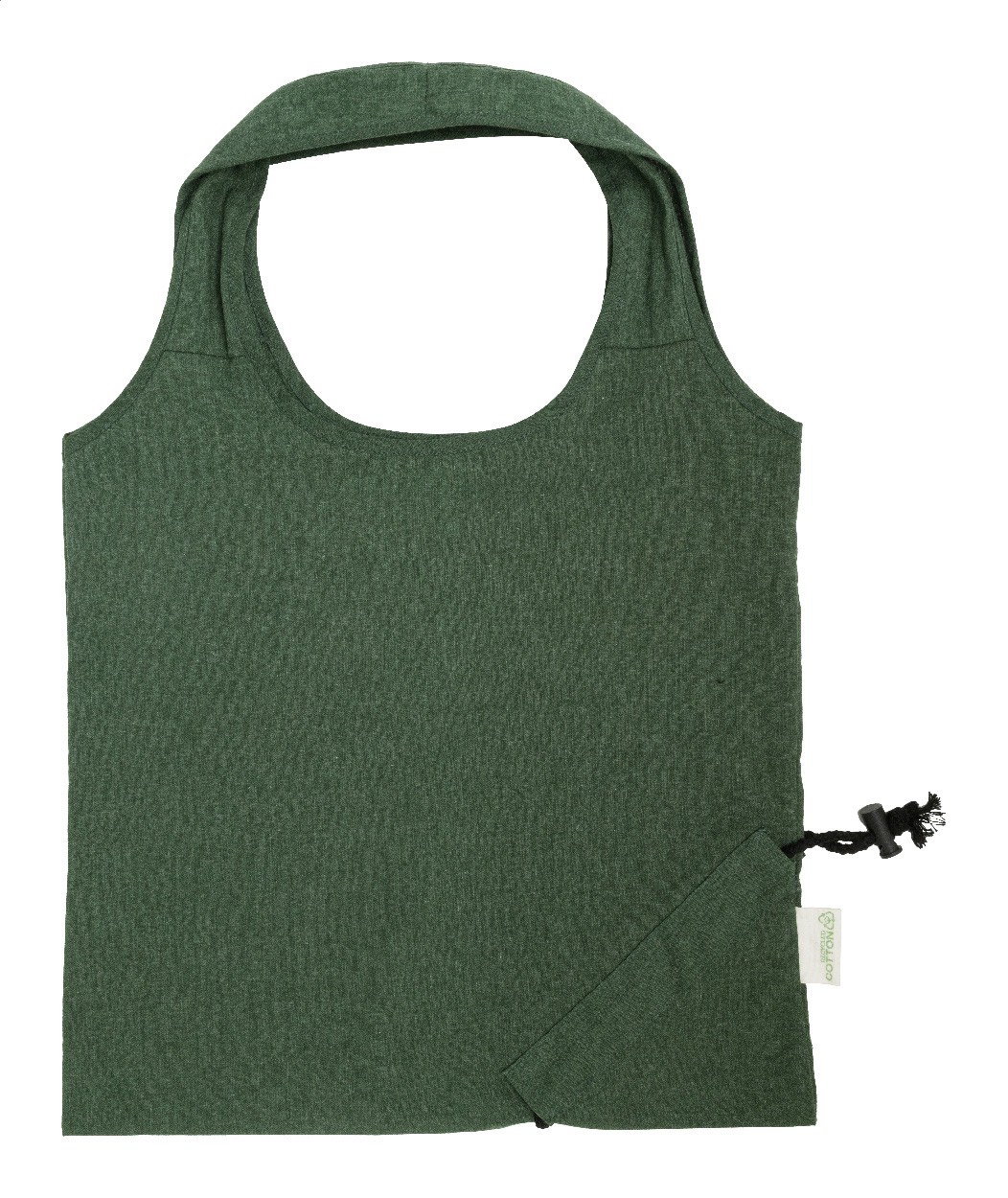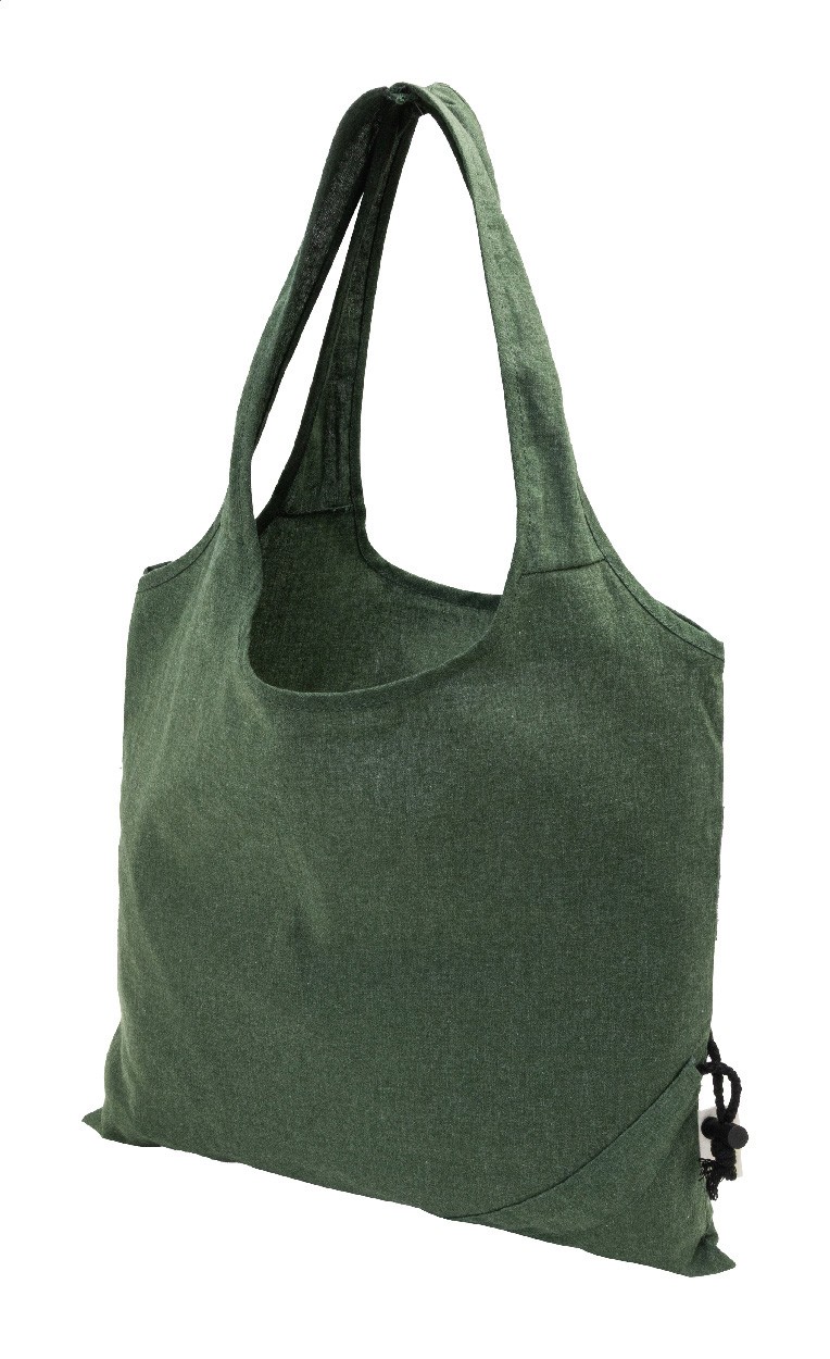 Sacoșă de cumpărături pliabilă, din 70% bumbac reciclat și 30% poliester RPET, 140 g/m². Cu etichetă distinctivă din bumbac reciclat.
