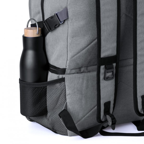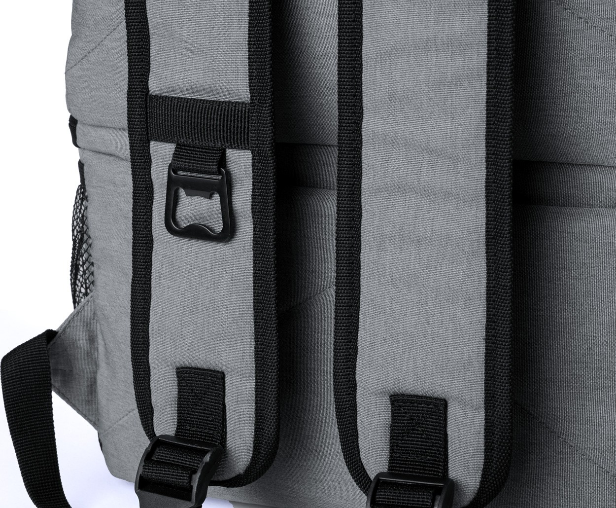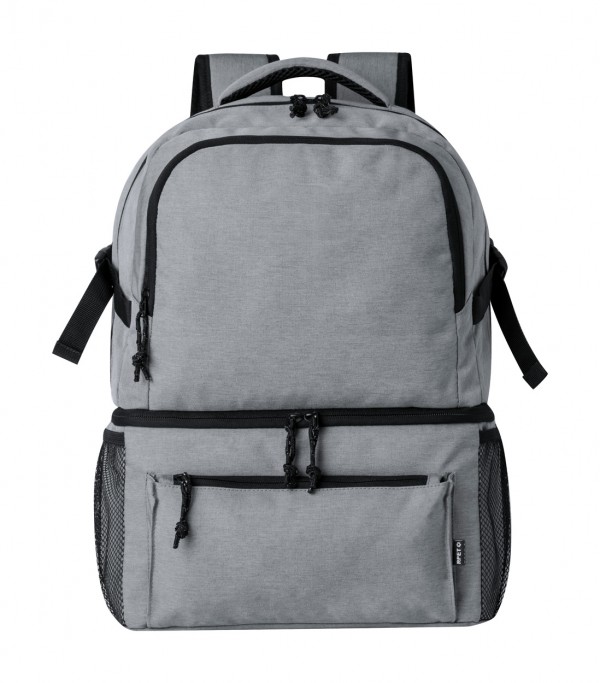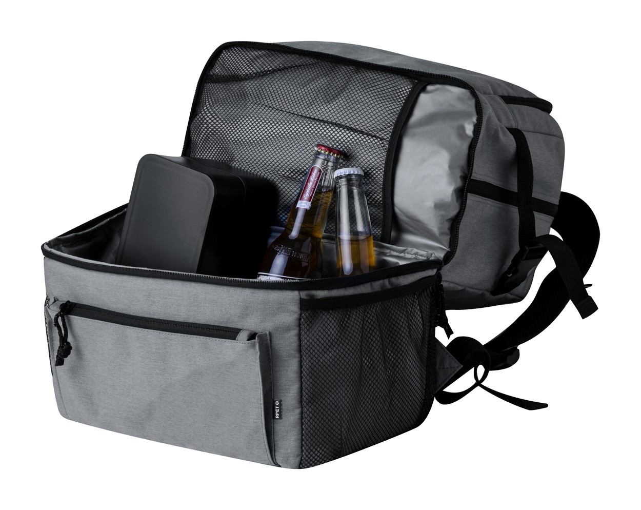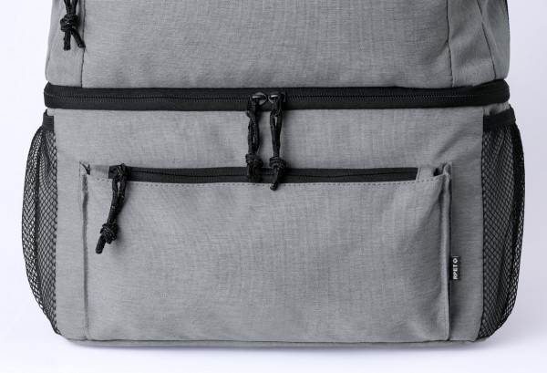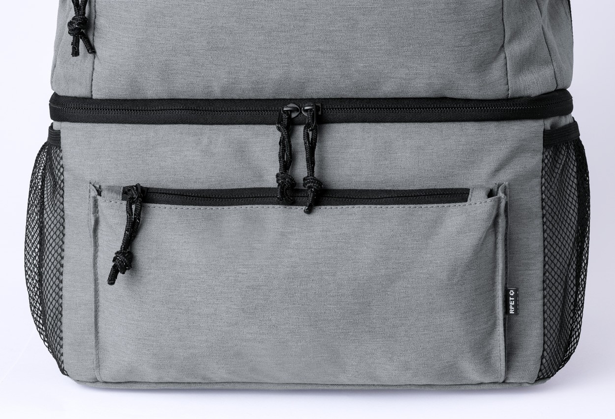 Rucsac RPET, cu compartiment frigorific căptușit din PEVA, buzunare cu fermoar, buzunare laterale din plasă, spate și bretele de umăr căptușite. Poliester 600D RPET, cu etichetă distinctivă RPET.