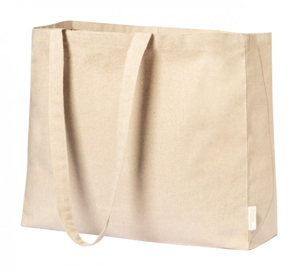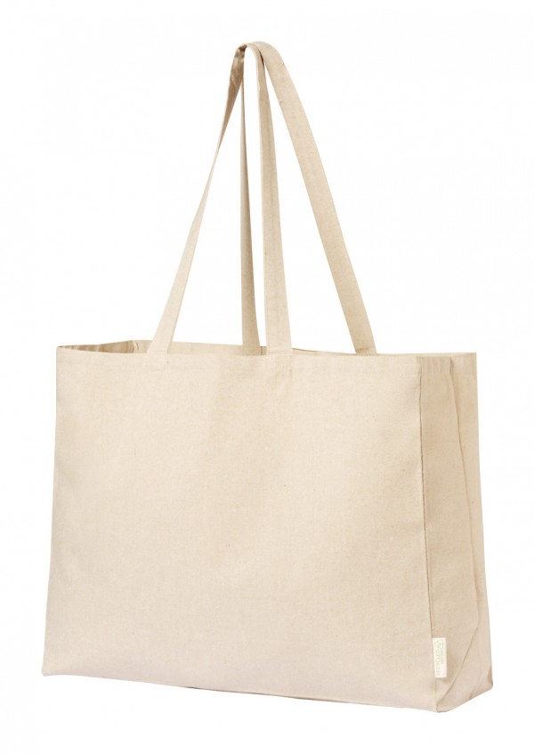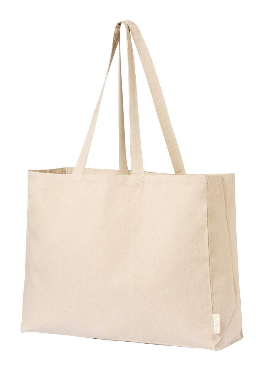 Sacoşăde cumpărături din bumbac reciclat, cu mânere lungi, burduf și etichetă distinctivă din bumbac reciclat. 100% bumbac reciclat, 240 g/m².
