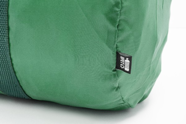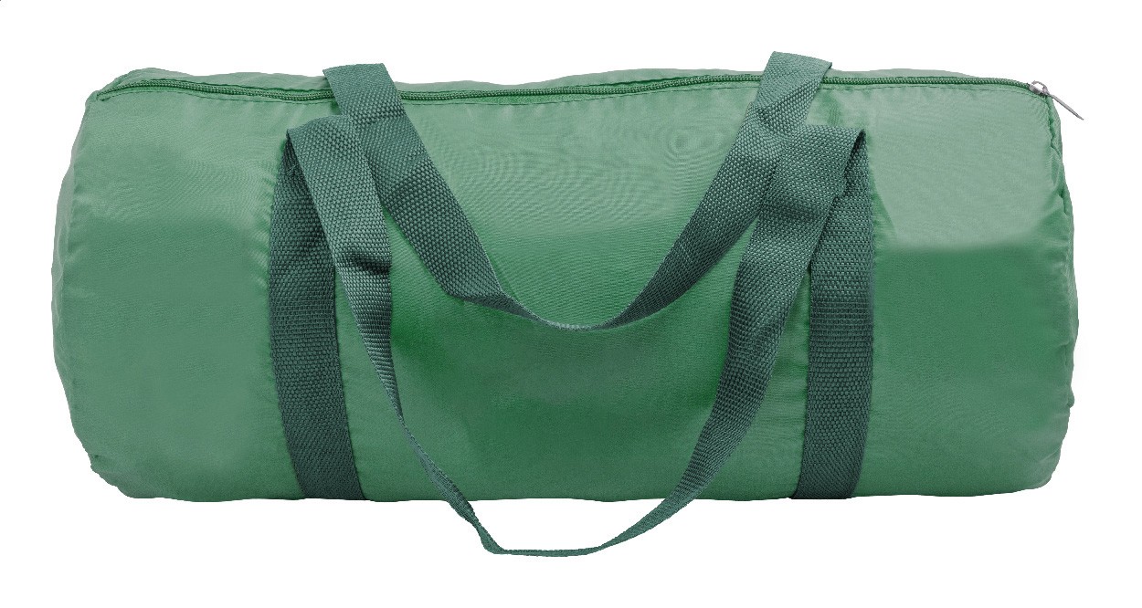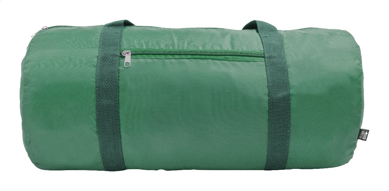 Geantă sport, din RPET, cu compartiment principal cu fermoar, buzunar frontal cu fermoar și mânere lungi. Poliester 190T RPET cu etichetă distinctivă RPET.