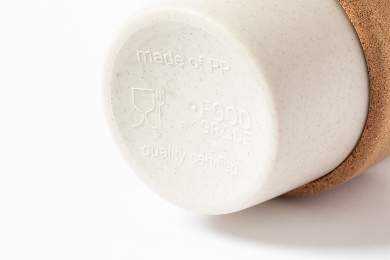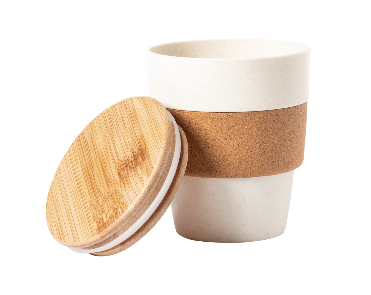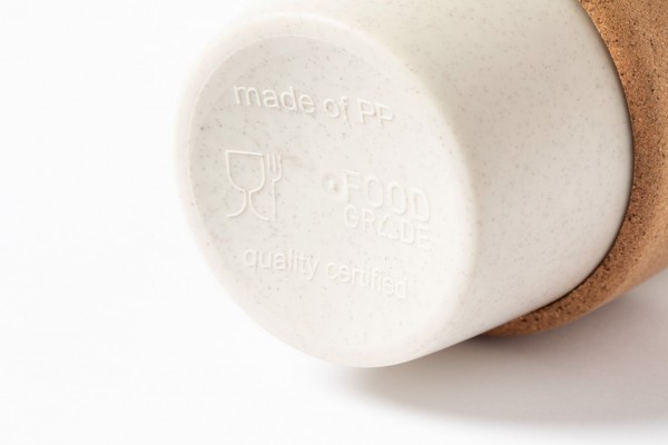 Cană de voiaj din plastic PP cu un singur perete, cu mâner din plută naturală și capac din bambus, 350 ml.