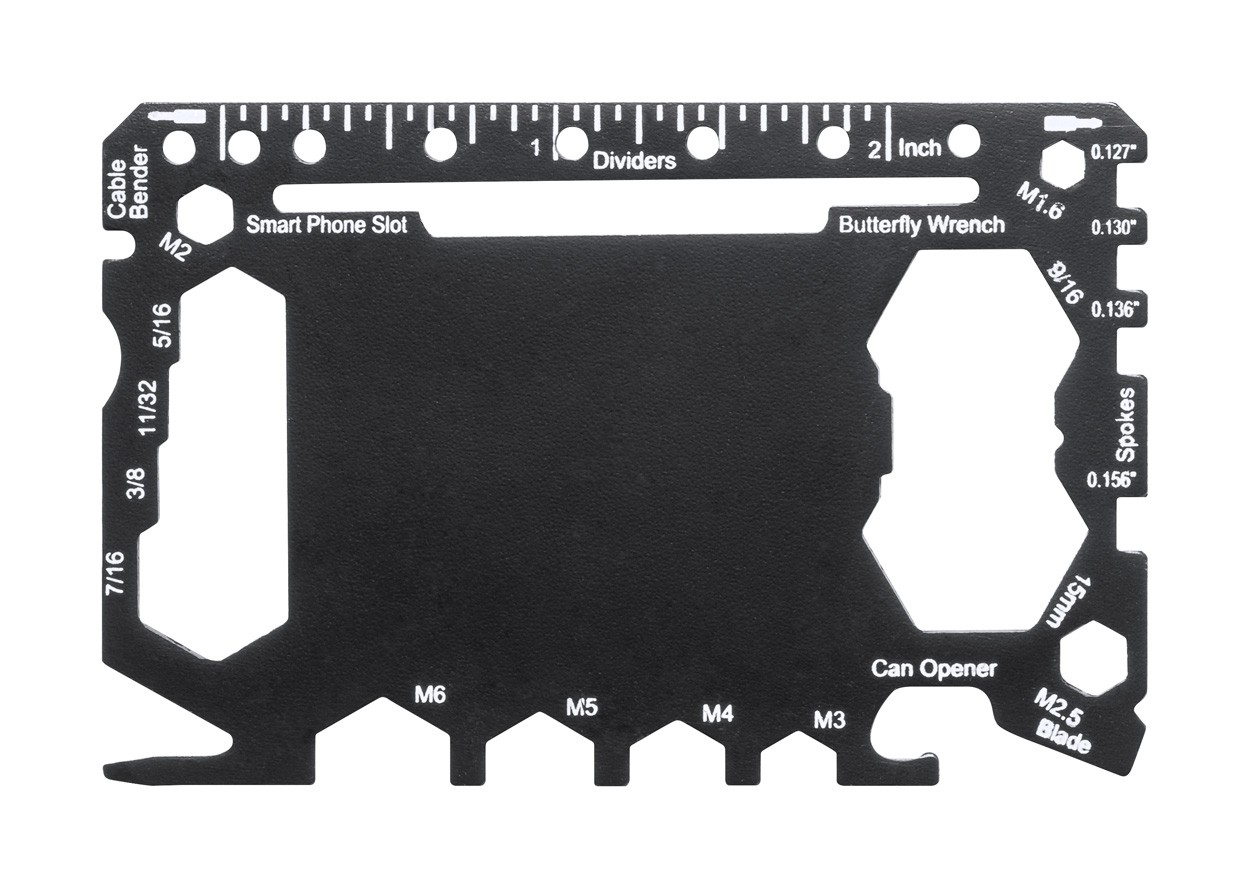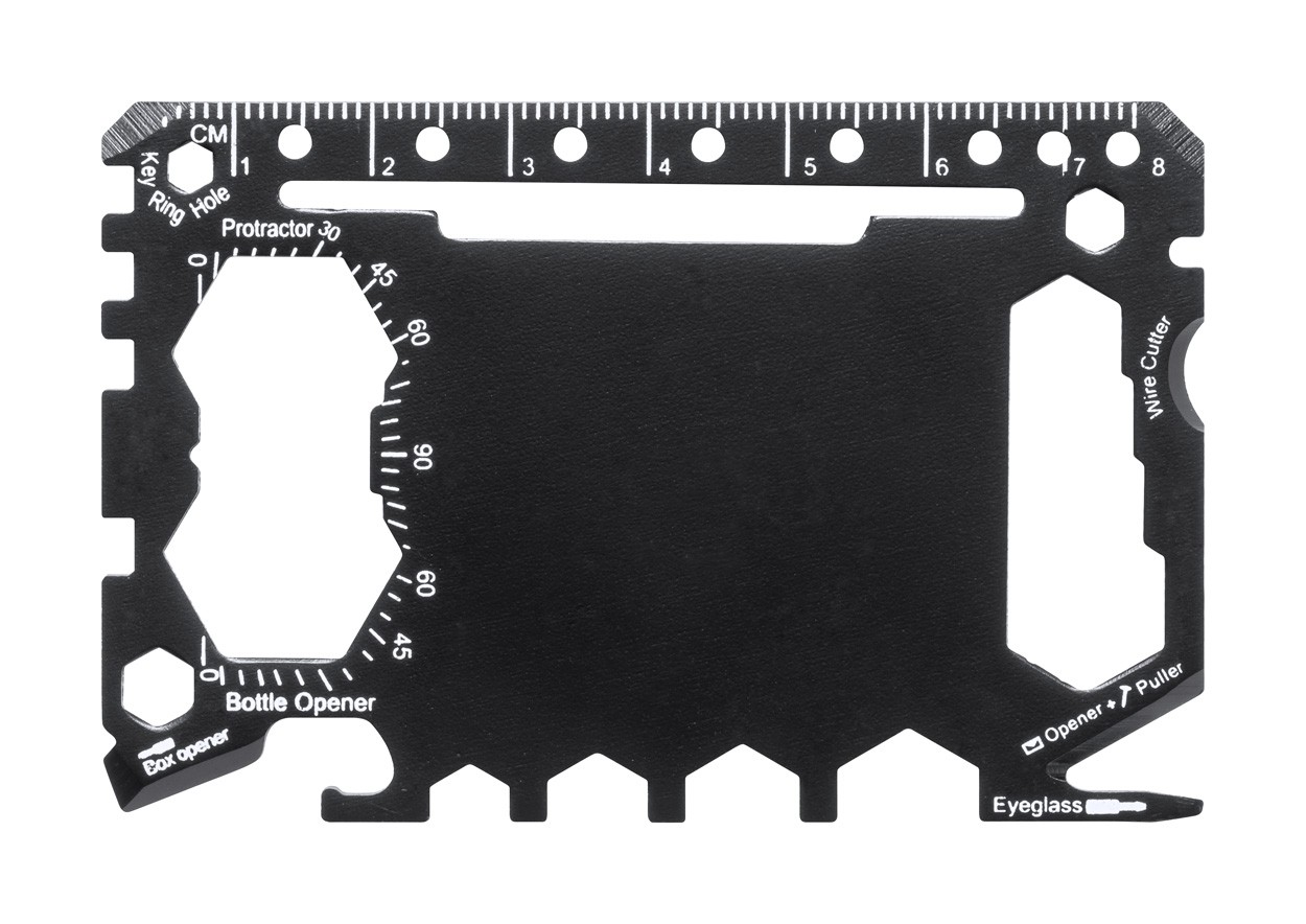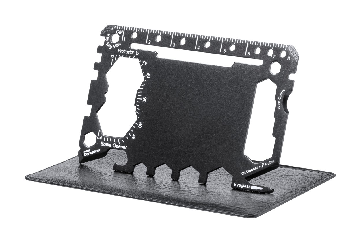 Unealtă multifuncțională, din oțel inoxidabil, în formă de card de credit, cu 17 funcții, în husă din piele PU.