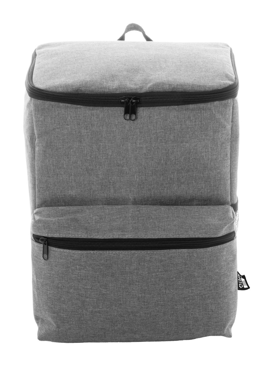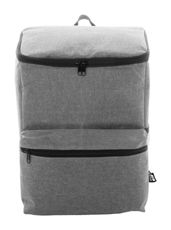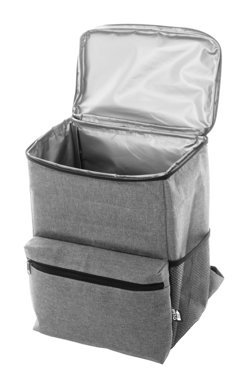 Rucsac frigorific, RPET, cu buzunar principal cu fermoar, buzunar frontal și buzunar lateral din plasă. Cu căptușeală PEVA și etichetă distinctivă RPET. Poliester 300D RPET.