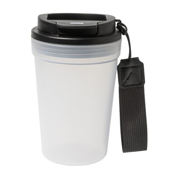 Pahar de voiaj, din plastic PP, cu finisaj mat, cu un singur perete, cu capac pentru băut și curea de transport din poliester RPET. 400 ml.