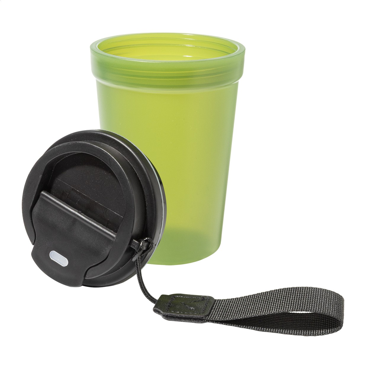 Pahar de voiaj, din plastic PP, cu finisaj mat, cu un singur perete, cu capac pentru băut și curea de transport din poliester RPET. 400 ml.