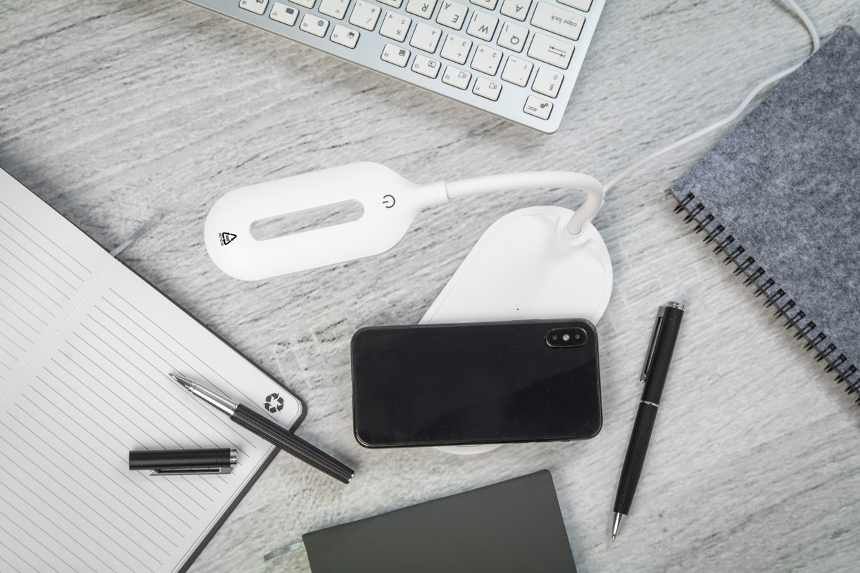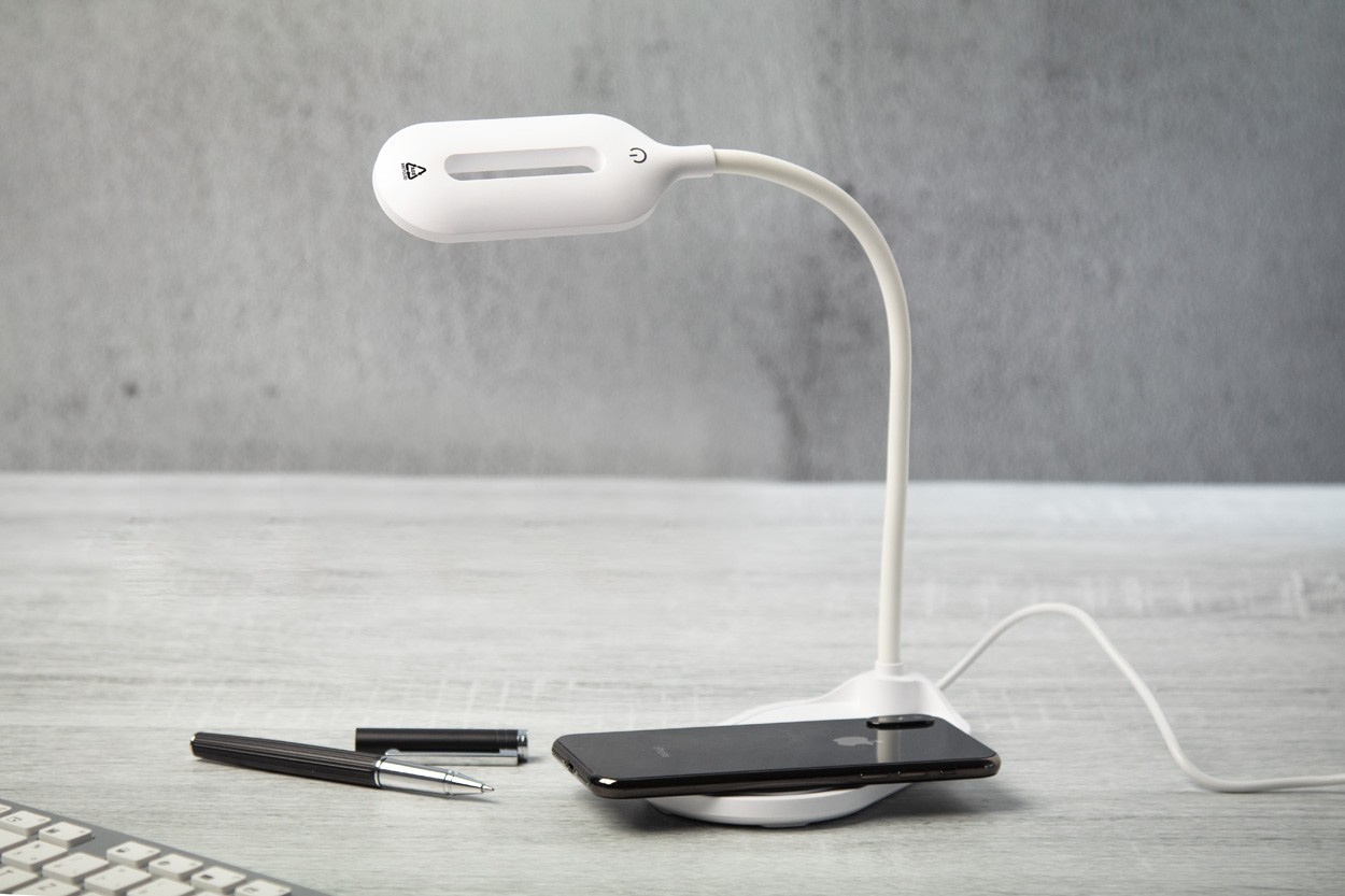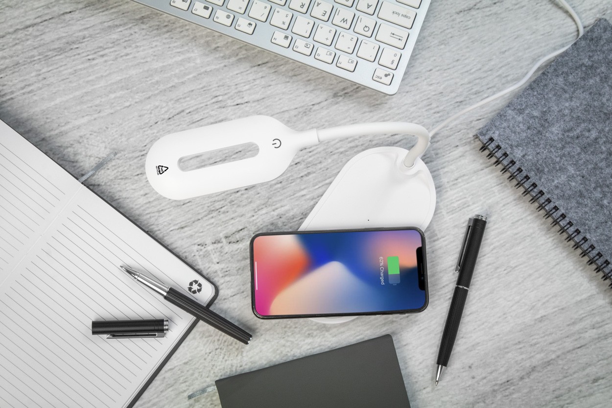 Lampă de birou multifuncțională, din ABS reciclat, cu încărcător rapid fără fir încorporat (15W). Cu 10 LED-uri, buton sensibil la atingere și luminozitate reglabilă. Inclusiv cablu de încărcare USB.