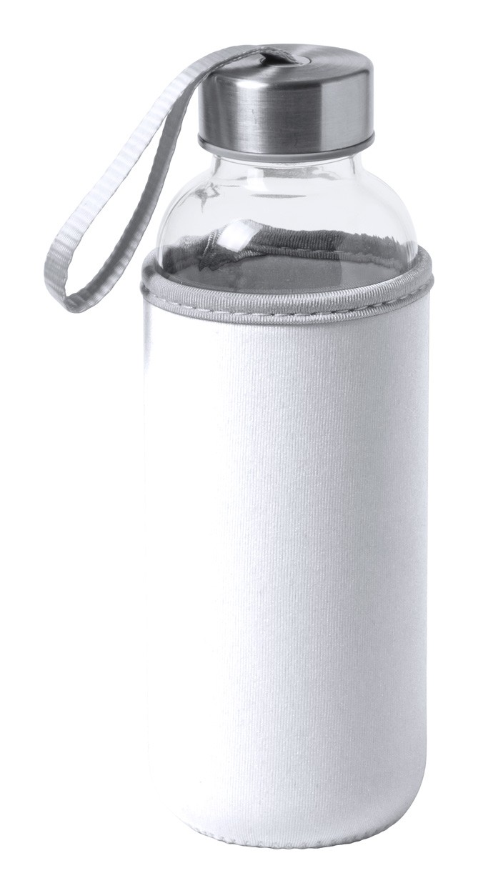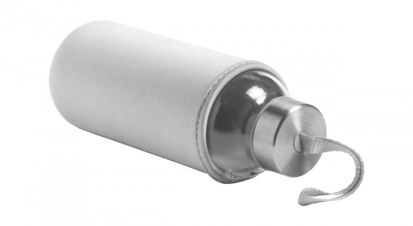 Sticlă din sticlă, cu curea de transport pe capac și capac din neopren colorat. 420 ml. Nu este potrivită pentru băuturi carbogazoase.