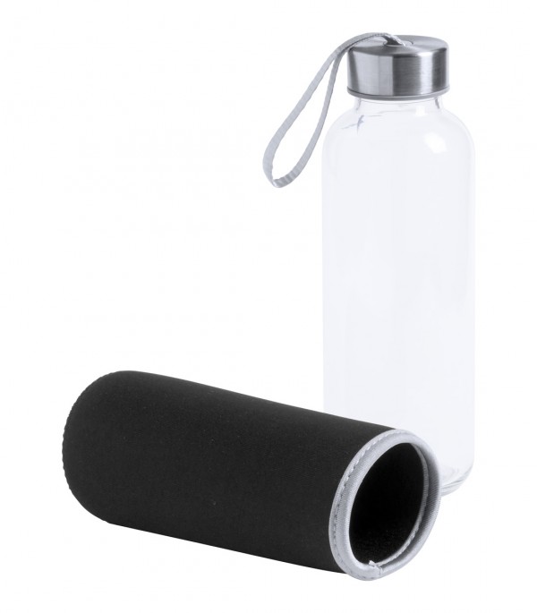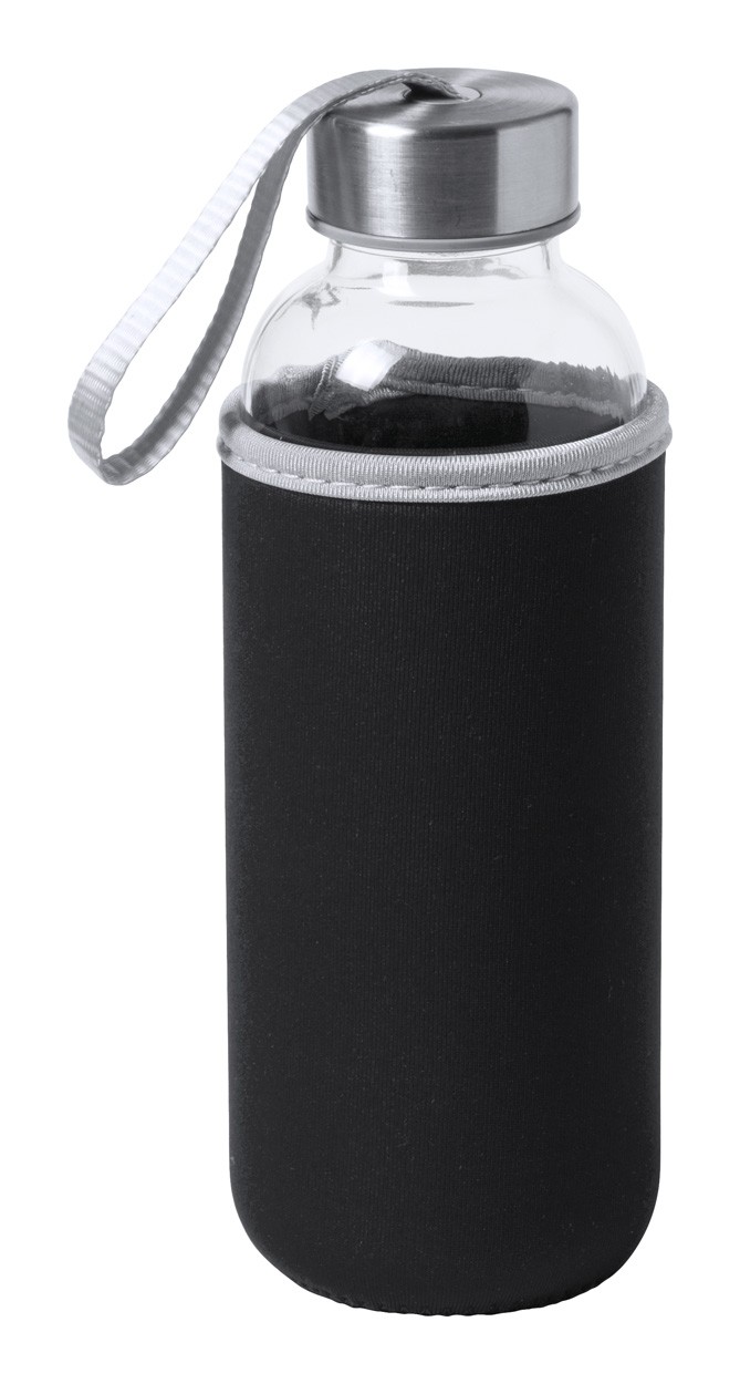 Sticlă din sticlă, cu curea de transport pe capac și capac din neopren colorat. 420 ml. Nu este potrivită pentru băuturi carbogazoase.
