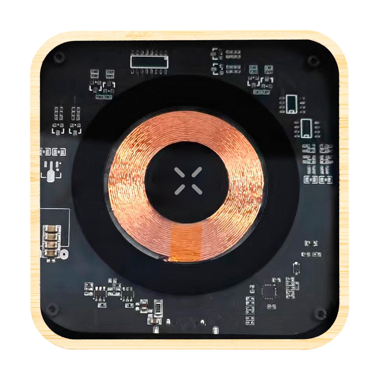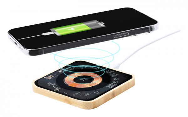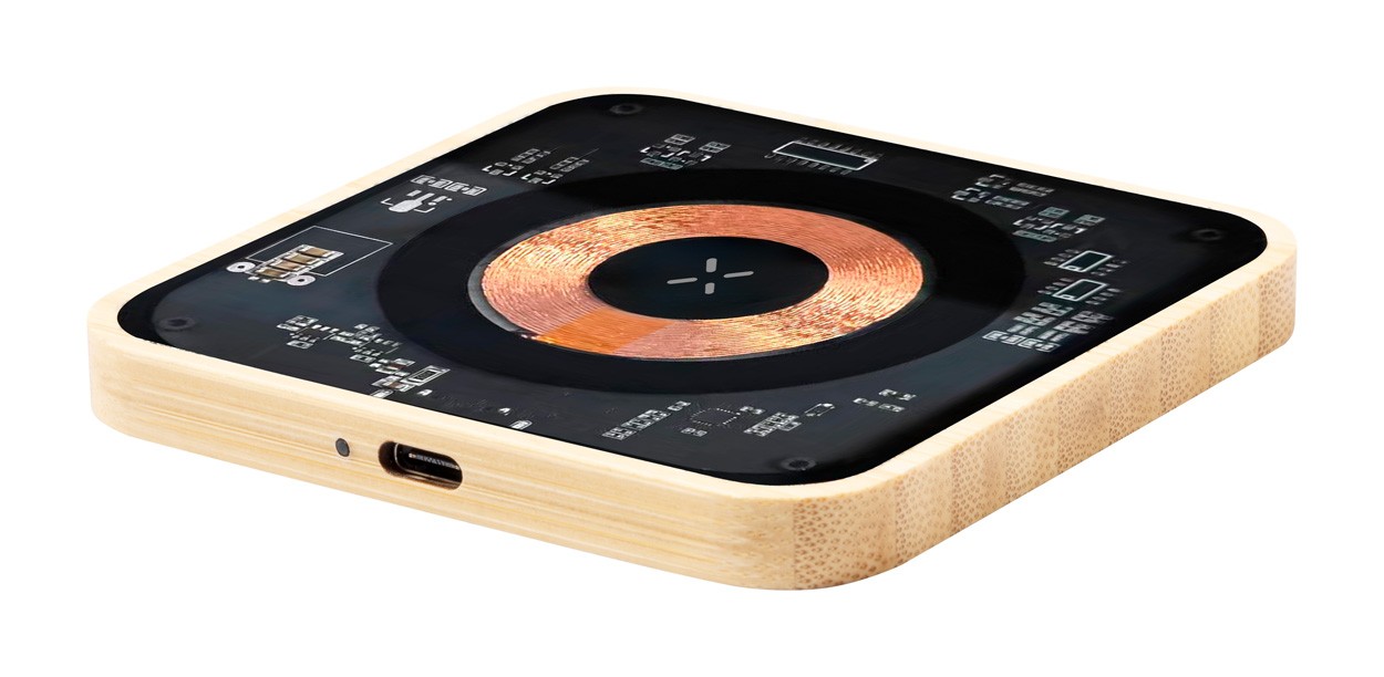 Wireless fast charger (15W) in bamboo and semi-transparent housing with visible electronic components. Including USB charger cable.