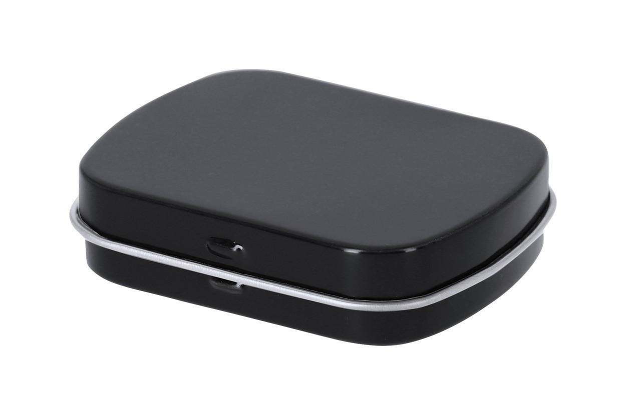 Cutie metalică dreptunghiulară, cu bomboane cu mentă, cu cca. 23 gr bomboane fără zahăr.