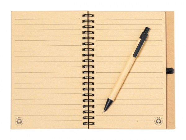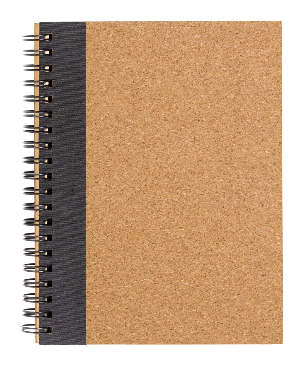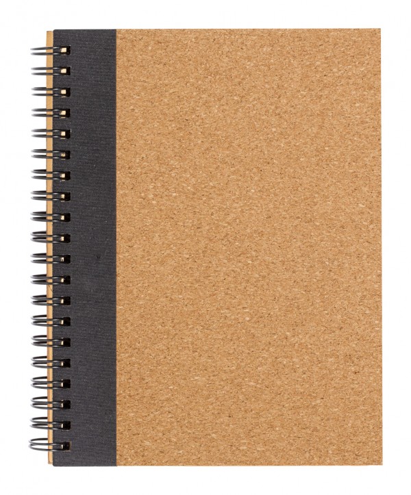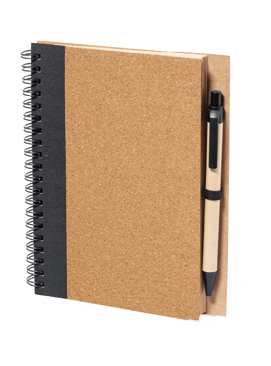 Caiet spiralat, acoperit cu plută naturală, cu suport pentru pix și 80 de foi dictando din hârtie kraft reciclată, dimensiune A5. Inclusiv pix din hârtie reciclată cu mină albastră.