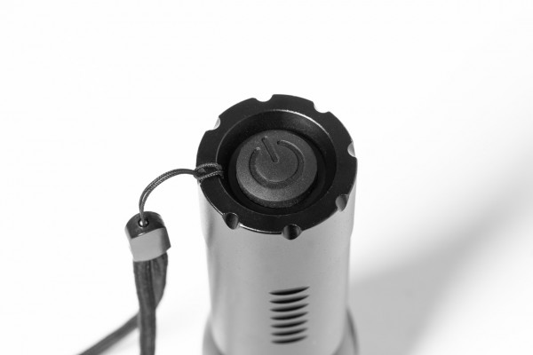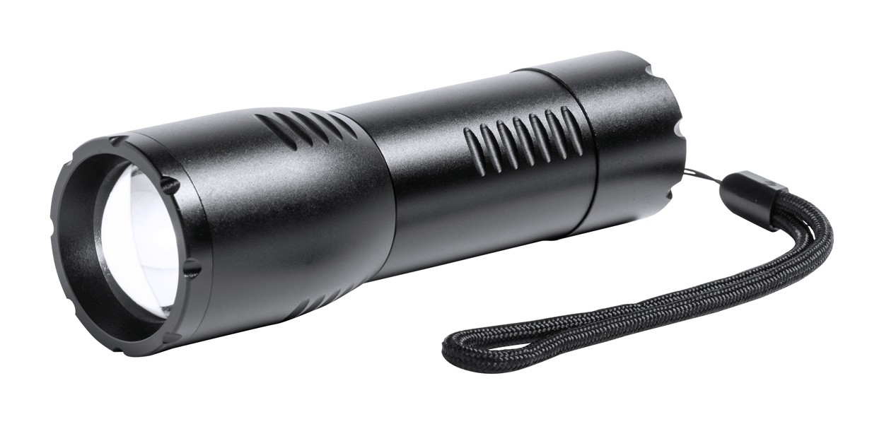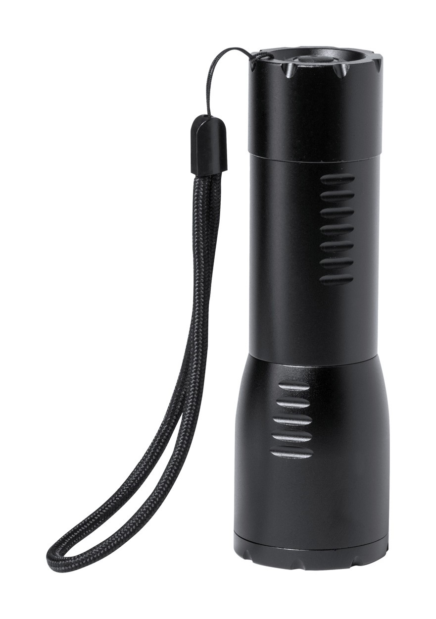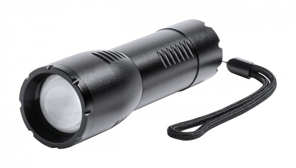 Lanternă LED, din aluminiu, cu curea de transport și 3 moduri de lumină. Funcționează cu 3 baterii AAA, se livrează fără baterii.