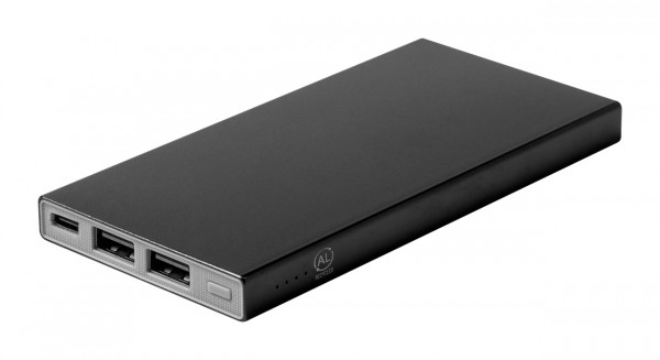 Baterie externă USB, din aluminiu reciclat, cu baterie de 4000 mAh. Cu 2 porturi USB și 1 USB-C pentru încărcător. Port de intrare USB-C. Inclusiv cablu de încărcare USB.