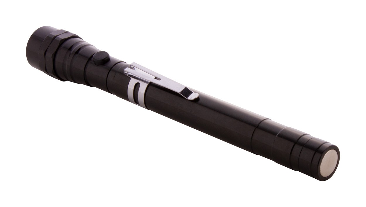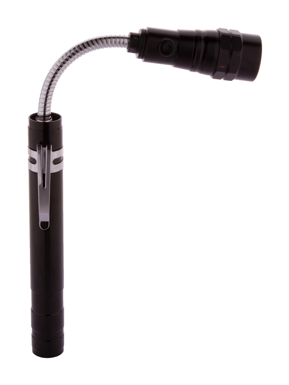Lanternă cu 3 LED-uri, din aluminiu, cu cap extensibil si flexibil, magnet deasupra și clip metalic lateral. Inclusiv baterii tip buton. Max. lungime: 57 cm.