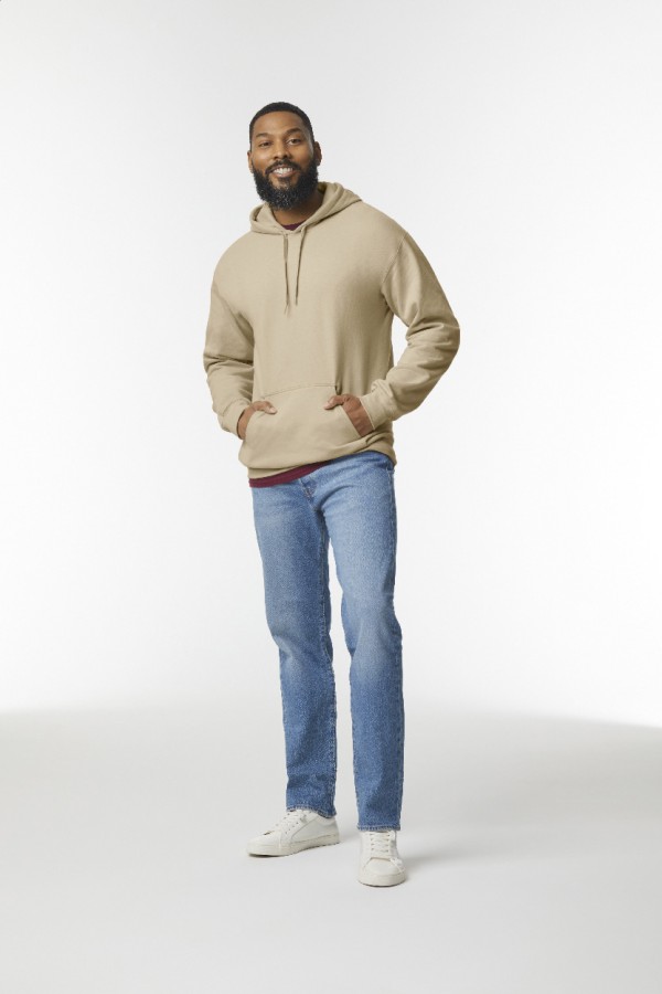 Hanorac cu glugă, din 80% bumbac și 20% poliester, cu buzunar frontal. 285 g/m² (alb 278 g/m²). Produs marca Gildan.